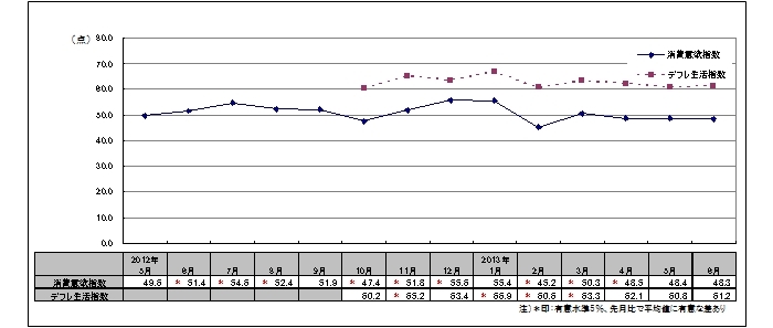 2013年6月は [消費意欲指数 = 48.3点] [デフレ生活指数 = 61.2点]