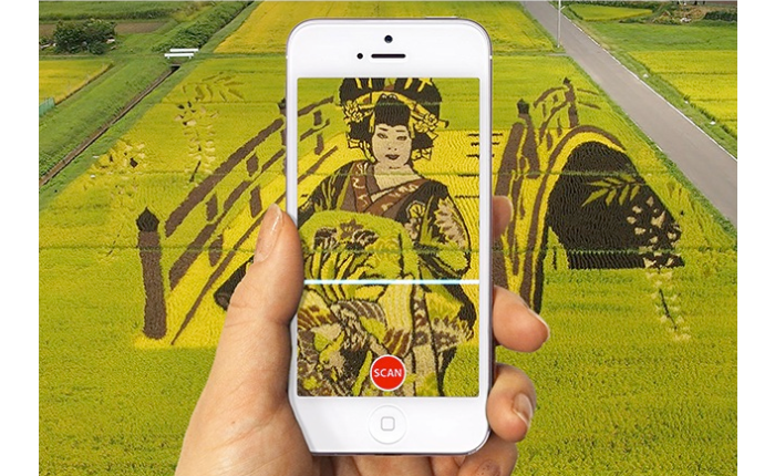 デジタルテクノロジーと農業との融合にトライ。田んぼに描かれた広大な絵「田んぼアート」をスマートフォンの専用アプリのカメラでかざすと、その中から特異点を認識しお米を購入できるECサイトへ移動。訪れた人は旅の思い出を残しながら同時にお土産を買うことができる。