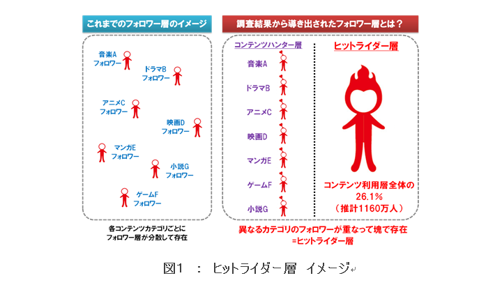 株式会社博報堂DYメディアパートナーズ(本社:東京都港区、社長:大森壽郎)と株式会社博報堂(本社:東京都港区、社長:戸田裕一)の共同研究プロジェクト「コンテンツビジネスラボ」(※1)は、全国調査「コンテンツファン消費行動調査」(※2)の2014年度版を実施いたしました。その調査結果から、ヒットするコンテンツの背景には「Ⅰ.新しく興味深いコンテンツを探し求める層(「コンテンツハンター層」と呼ぶ。いわゆるアーリーアダプターと言われる方々)」と、「Ⅱ.同層の後を追いかけ世の中のヒット現象そのものに反応する層(「ヒットライダー層」と呼ぶ。いわゆるフォロワーと言われる方々)」の2層が存在すること、ヒットの条件として国内で1160万人いると推計されるヒットライダー層を巻き込んでいることなどが分かりました。