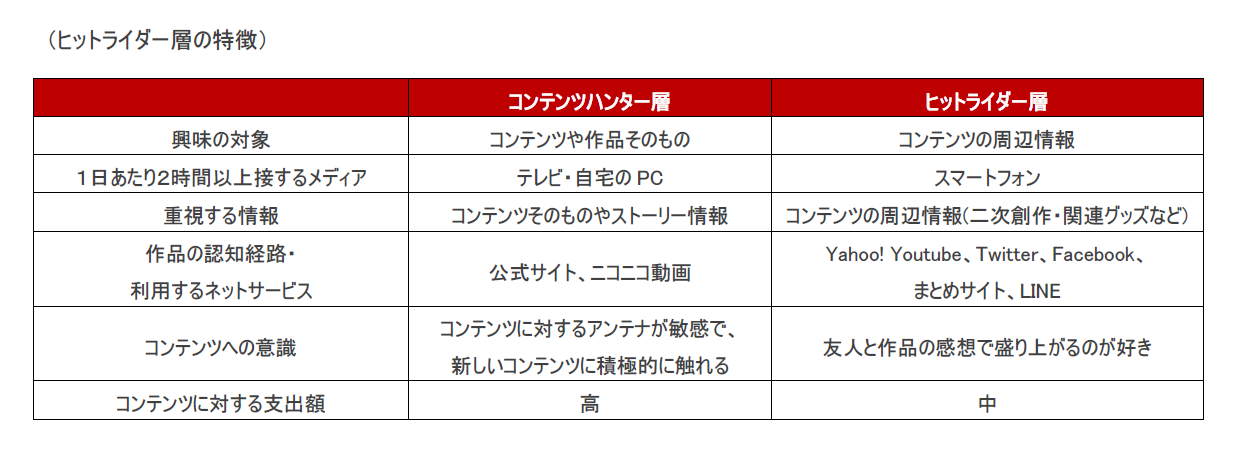 「ヒットライダー層」の特徴としては、①複数のコンテンツや作品に対してフォロワーとして(コンテンツを)消費するが、②「コンテンツそのものやストーリーのみの情報」には反応せず、③「友人・知人とのコミュニケーションを目的にした祭」に便乗する語りでコンテンツを消費する傾向があることが分かりました。