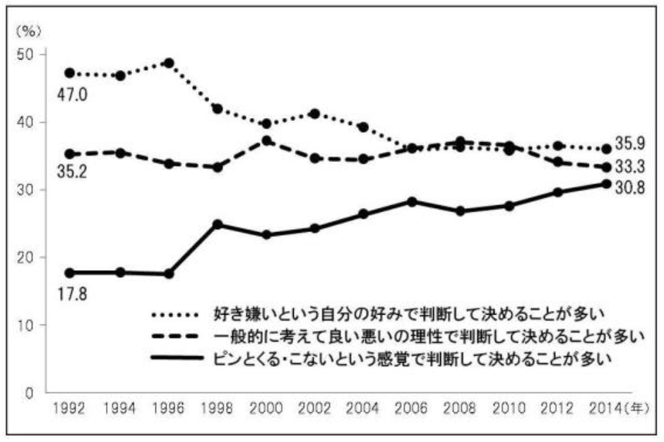モノ・サービスの選択行動は「好き嫌いで選ぶ」人が減少かつ高齢化し、「ピンと来る来ないで選ぶ」人は倍近くに増加、全年代層に広がるという傾向にあります。また「良い悪いで選ぶ」人はほぼ横ばい(グラフ 3)。ピンで物事を決めるピン衆と、良いか悪いかロジカルに決めるロジ衆。この2つに生活者の行動スタイルは収束していくと考えます。