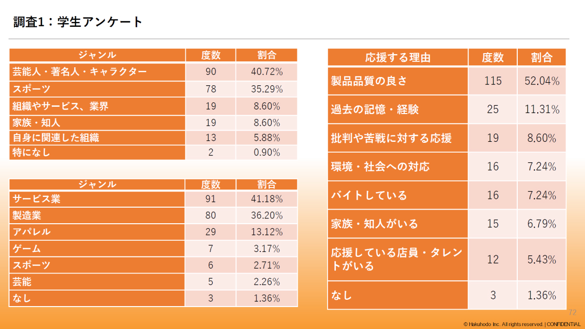 1つ目の調査は、東京都立大学の学生を対象にしたアンケートです。221人の学生に、応援している人と企業・ブランドを挙げてもらい、その理由を記載してもらいました。結果を見ると、応援している人は芸能人やスポーツ選手、応援している企業はサービス業も製造業も同じようにありました 。企業を応援する理由として圧倒的に多かったのが「製品品質の良さ」でしたが、ほかに興味深い理由として「過去の記憶・経験」や「批判や苦戦に対する応援」などがありました。子どもの頃に最初に履いた靴のブランドを応援している人、インフレの中で値上げをせずに頑張っている企業を応援している人などがいるようです。