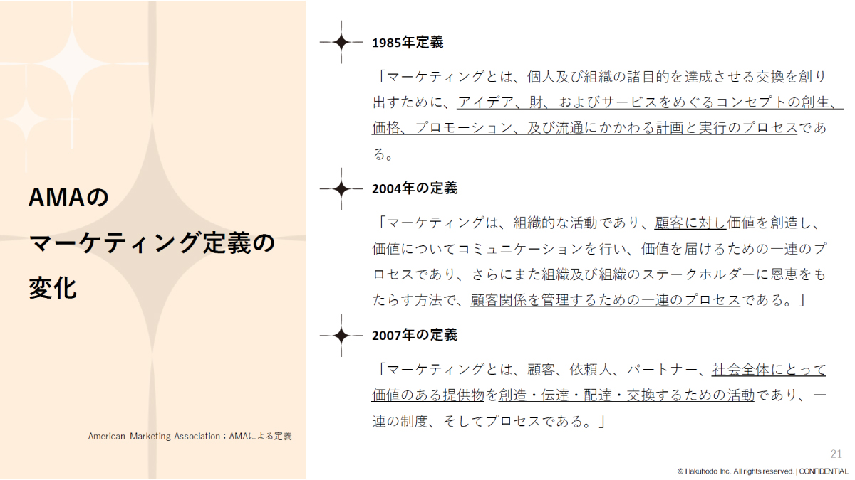 AMA(アメリカマーケティング協会)の定義もまた時代とともに変化しています。1985年、2004年、2007年において、以下の図のように変遷しました。
