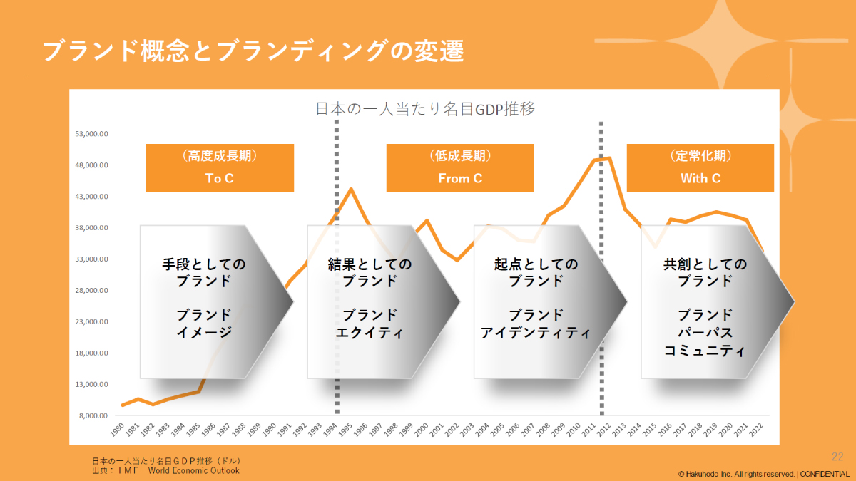 このようなマーケティングの変化とともに、近接する領域であるブランドやブランディングに関する考え方も大きく変わっています。高度成長期のブランドの考え方は「to C(カスタマー=顧客)」でした。それが低成長期になると「From C」、すなわちブランディングとは顧客のニーズや思いを起点とした取り組みであると考えられるようになりました。近年では、「With C」、つまりブランドとは顧客とともに創造していくものであるという考え方が主流になりつつあります。