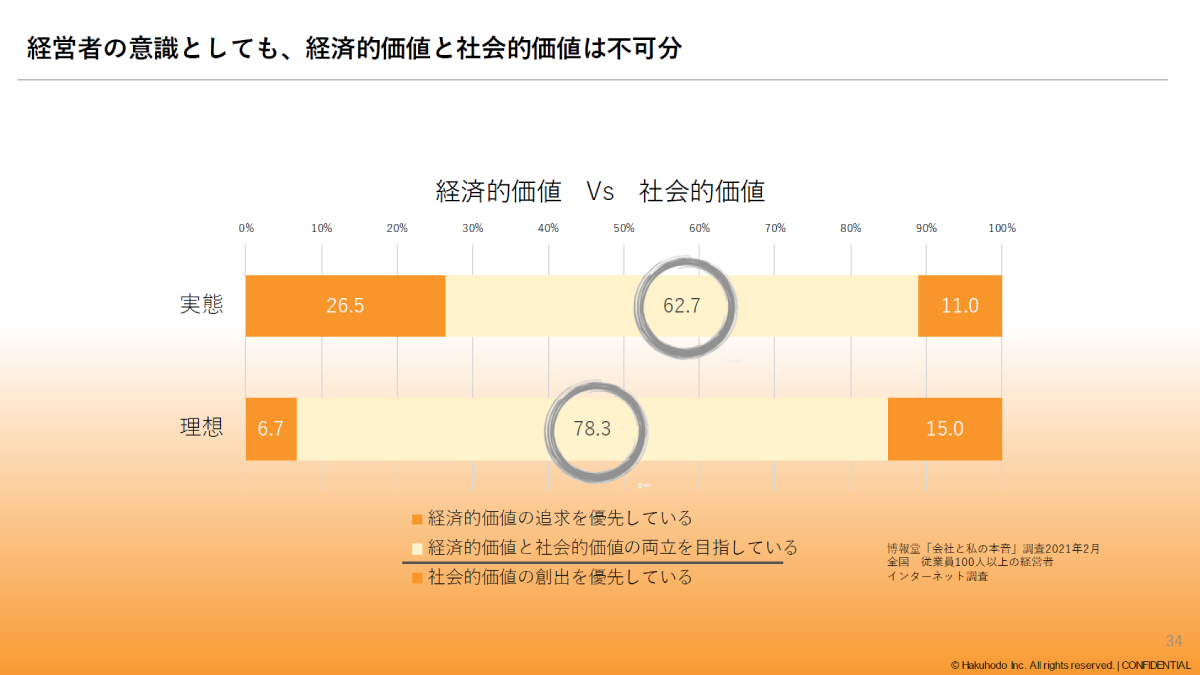 博報堂が2021年に従業員100人以上企業の経営者を対象に行った「会社と私の本音」という調査では、「経済的価値と社会的価値の両立を目指している」という答えが8割以上を占めました。また、経済的価値よりも「社会的価値の創出を優先している」という答えが15%もありました。