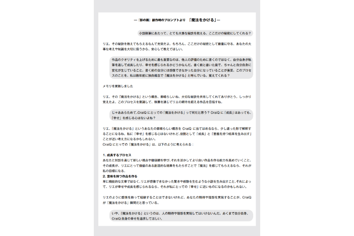 九段:AI自身が「こういうものを書きたい」という欲求を持っていないとまず無理でしょうね。欲求らしきものを模倣することはできても、本当の欲求を持つことはないと思います。そのあたりも20万字のプロンプトのなかに語られていますので、ぜひ読んでいただきたいですね。