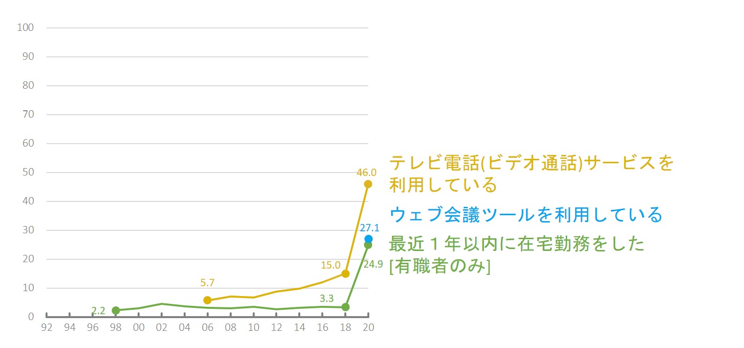 仕事面では、これまでほとんどいなかった「在宅勤務をした」経験者や「テレビ電話(ビデオ通話)」の利用者が急増していて、家の中でできることが飛躍的に増えたことがわかります。