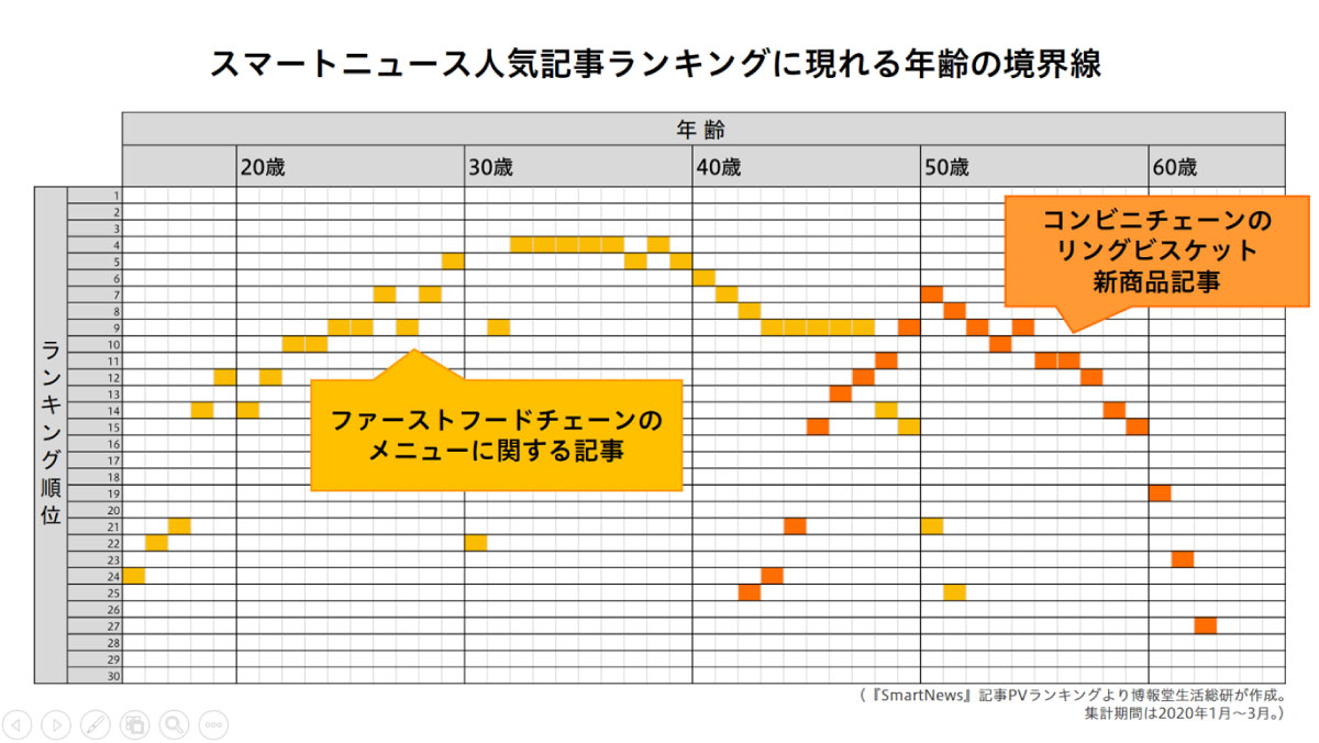 こういったデータは、開発側がおそらく知らない「発見」だと思うんです。50代をターゲットにしたリングドーナツはきっとまだ作られていませんよね。このような、ヒアリングベースではなかなか出てこない意外なセグメントの発見や、仮説を裏切るようなマーケティングに役立つデータが見えてくるところも、SmartNewsの記事閲読データから読みとれる大きな特徴だと思います。