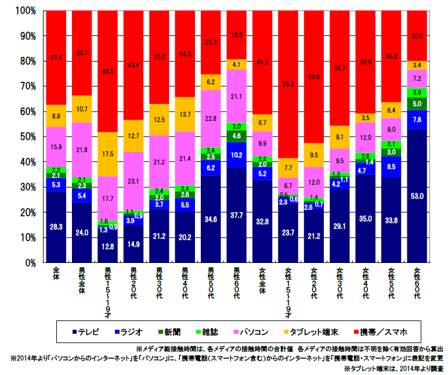 ①メディア総接触時間は432.7分。「携帯電話/スマートフォン」のシェアが前年比約3%増、「テレビ」が約2%減。