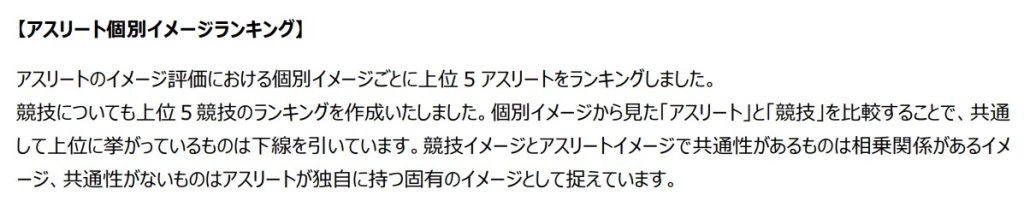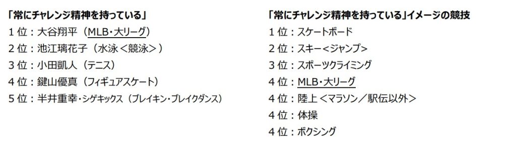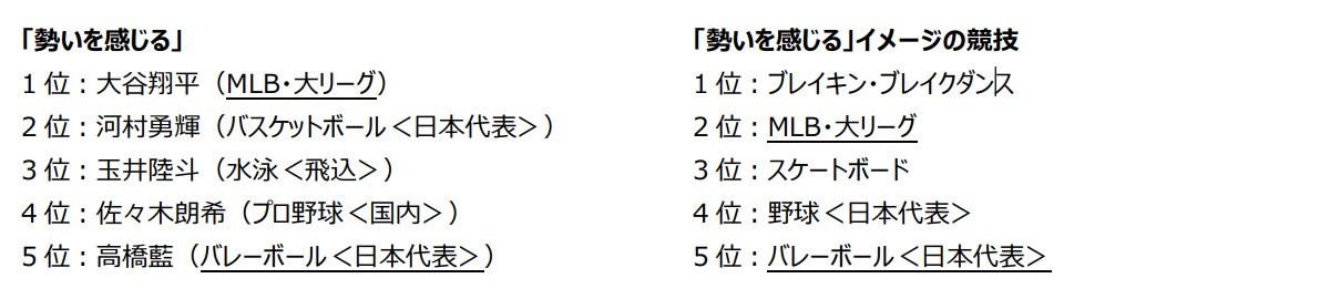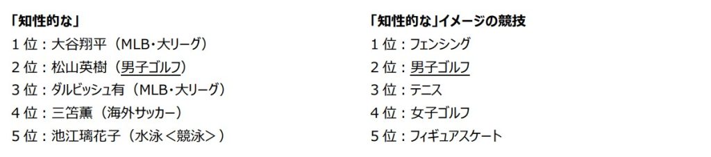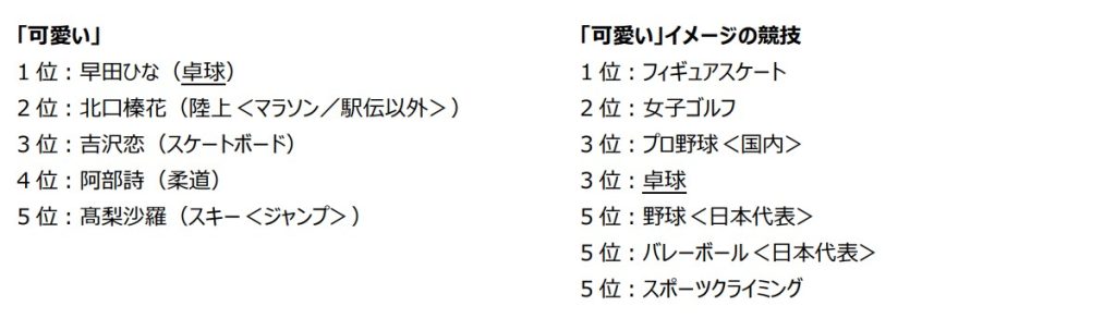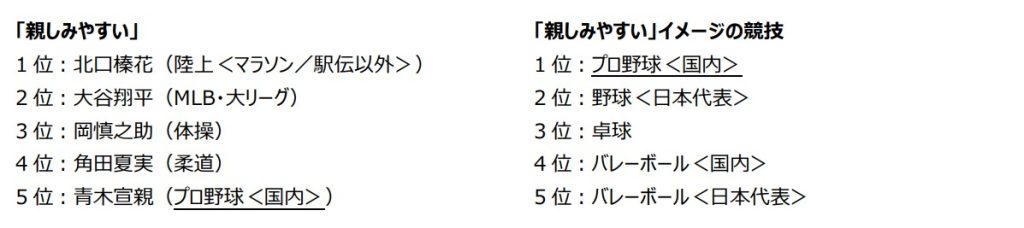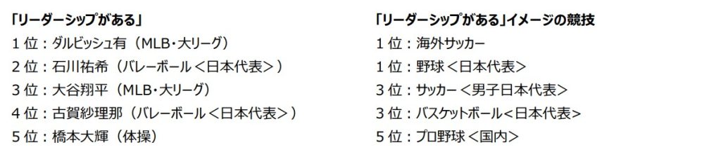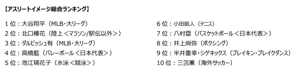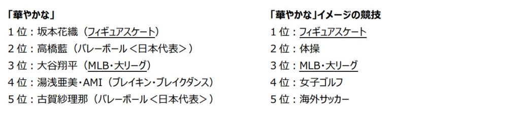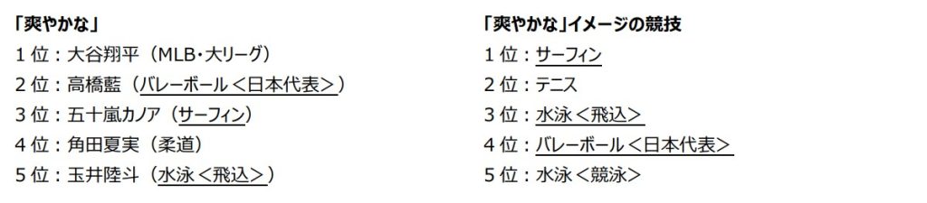 アスリート個別イメージでは、「華やかな」で坂本花織(フィギュアスケート)、「親しみやすい」で北口榛花(陸上<マラソン/駅伝以外>)、「可愛い」で早田ひな(卓球)、「リーダーシップがある」でダルビッシュ有(MLB・大リーグ)が1位となりました。