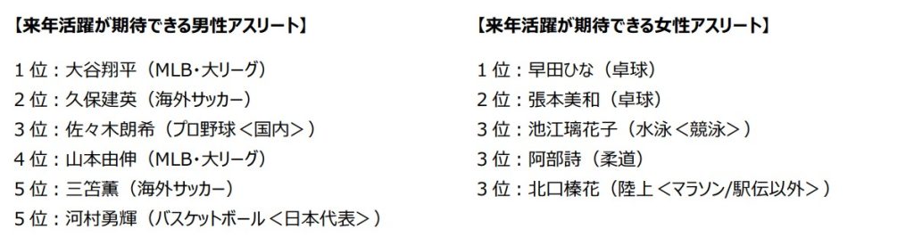 「来年活躍が期待できる」アスリートは、男性で1位:大谷翔平(MLB・大リーグ)、2位:久保建英(海外サッカー)、3位:佐々木朗希(プロ野球<国内>)、4位:山本由伸(MLB・大リーグ)、5位:三笘薫(海外サッカー)/河村勇輝(バスケットボール<日本代表>)となりました。女性は1位:早田ひな(卓球)、2位:張本美和(卓球)、3位:池江璃花子(水泳<競泳>)/阿部詩(柔道)/北口榛花(陸上<マラソン/駅伝以外>)となりました。
