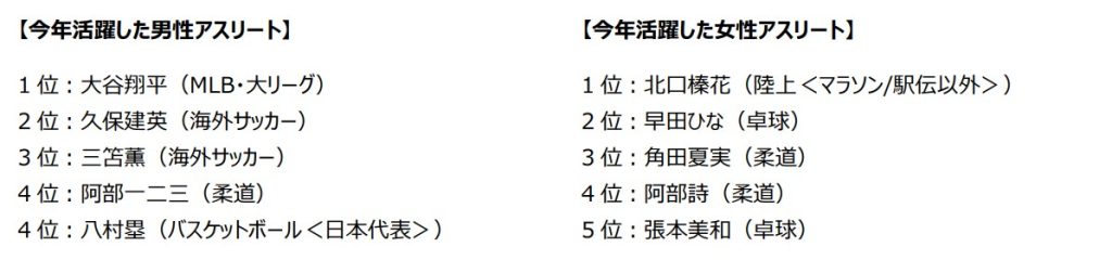 「今年活躍した」アスリートは、男性で1位:大谷翔平(MLB・大リーグ)、2位:久保建英(海外サッカー)、3位:三笘薫(海外サッカー)、4位:阿部一二三(柔道)/八村塁(バスケットボール<日本代表>)となりました。女性は、1位:北口榛花(陸上<マラソン/駅伝以外>)、2位:早田ひな(卓球)、3位:角田夏実(柔道)、4位:阿部詩(柔道)、5位:張本美和(卓球)となりました。
