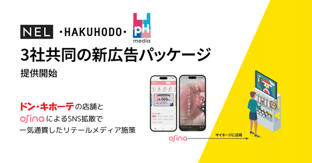 株式会社博報堂(本社:東京都港区、代表取締役社長:名倉健司、以下博報堂)は、ドン・キホーテを展開する株式会社パン・パシフィック・インターナショナルホールディングス(代表取締役社長CEO:吉田 直樹、以下PPIH)と共同設立したリテールメディア事業を展開する株式会社pHmedia(ペーハーメディア 本社:東京都渋谷区、代表取締役:奥田薫、以下pHmedia)、およびブランドとお客様を“推し”でつなぐプラットフォーム「osina」の運営を行うリテールテックカンパニーのNEL株式会社(本社:東京都渋谷区、代表取締役社長:西田 陸、以下NEL)の3社共同で、「osina」とドン・キホーテの店舗を活用した新たなリテールメディア広告パッケージの提供を開始いたします。