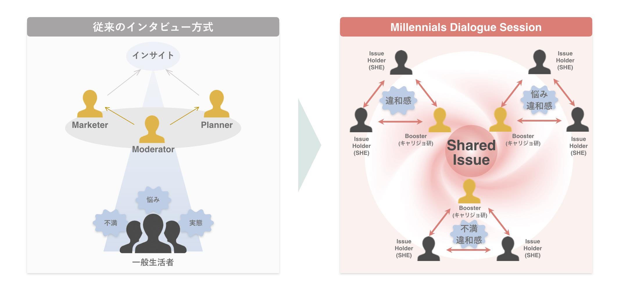 通常のインタビュー方式の生活者調査では個々人の体験談から一方向的にインサイトを抽出しますが、“Millennials Dialogue Session”では、個人それぞれが「イシュー」を抱えるSHE会員の、日常生活や社会への「違和感」や「不満」について博報堂キャリジョ研が媒介しながら”対話“を行うことで、そこに通底する新しい「シェアードイシュー」を抽出し、ミレニアル女性たちが共感する概念へと言語化します。