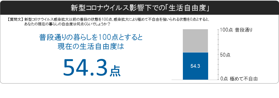 感染拡大以前の普段の状態を100点としたとき、現在の状況下における「生活自由度」が何点くらいかをきいたところ、54.3点となりました。
