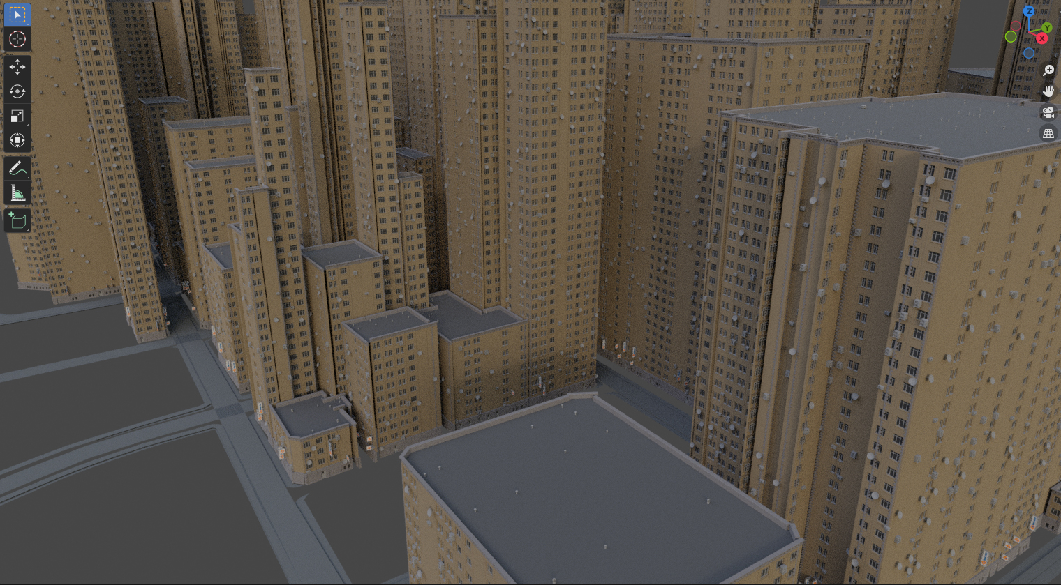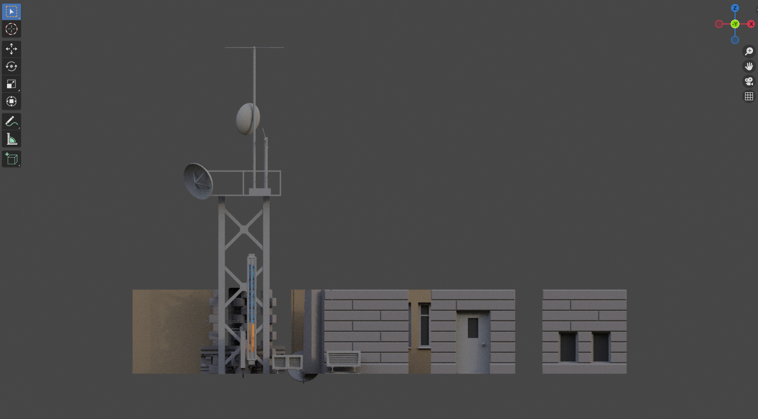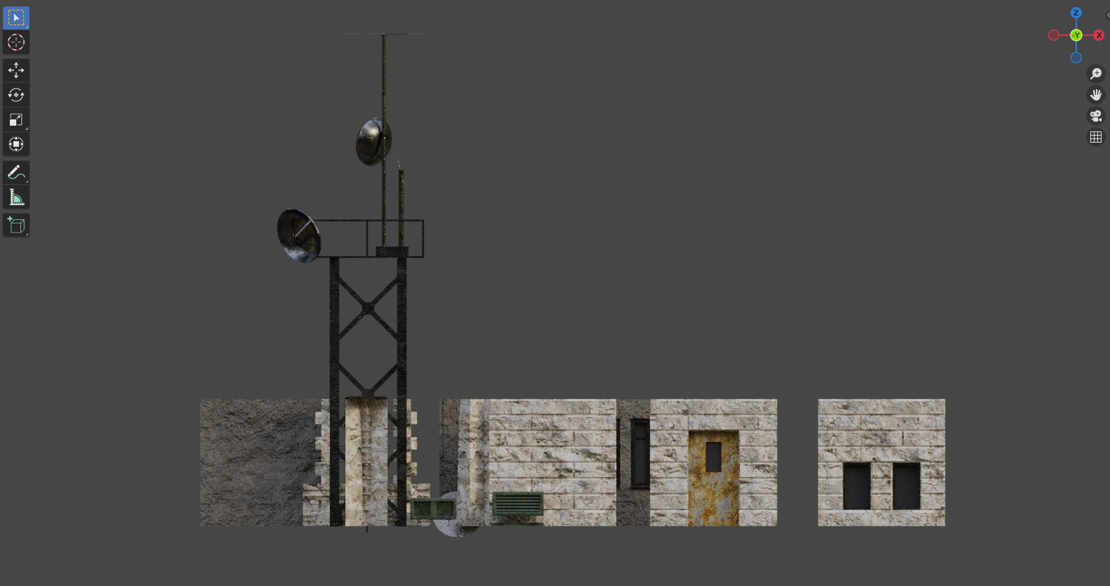 このようにアドオンを活用することで、簡単に建物を生成することができます。しかし、このままではレンダリングした際に壁に凹凸のない、味気ない建物になってしまうため、今回は基礎パーツに対してテクスチャやノーマルマップを設定し*2下図のようにカスタマイズしてみました。石のザラザラ感が出ました。