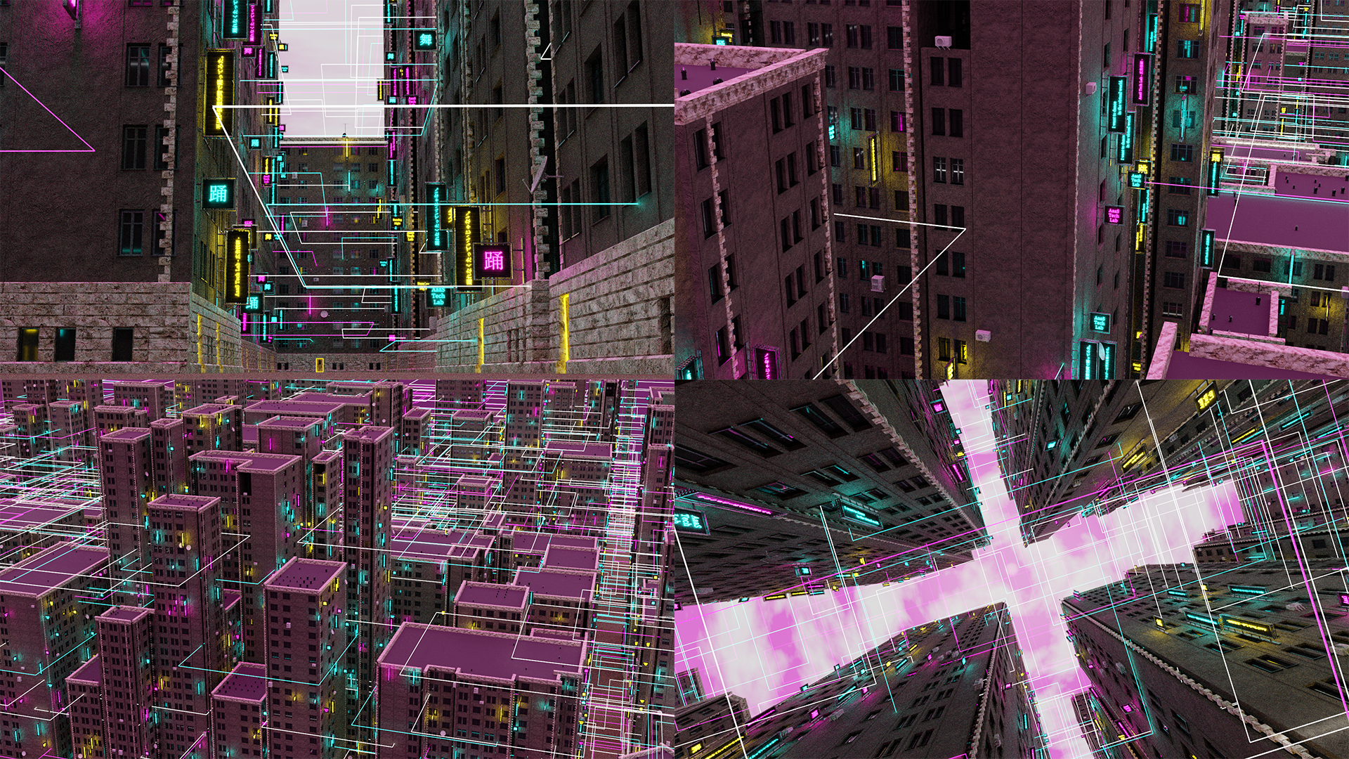 以下が、実際にできた街の概観です。建物の低層階には光が届きにくいため、意図的にドアの縁にネオン発光を点けたり、光のワイヤーを配置するなどしました。