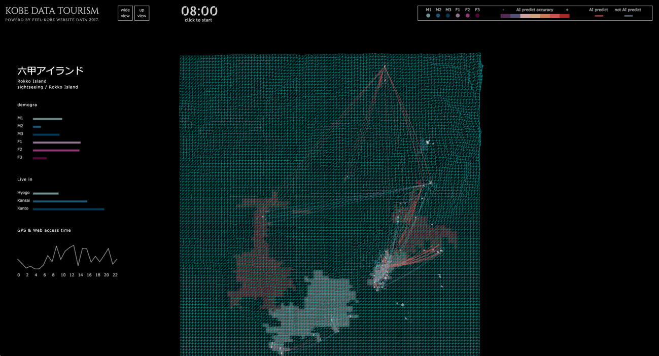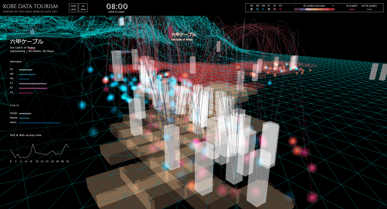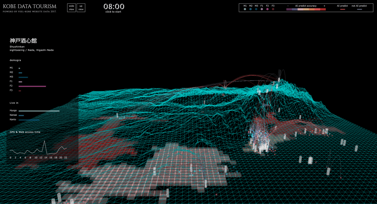 神戸市の観光マーケティングでは、GPSの位置情報データとDMPデータを使い、いつ誰がどのような天気で、過去どこに行ったかという情報に基づき、その時点での最適な情報を出しわける「リアルタイム観光ナビゲーションシステム」を作成した。またその結果得られた、AIが推薦した履歴と人が動いた軌跡をデータビジュアライズして観光施策に活用した。