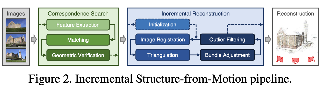 colmapでは、まず複数の画像から特徴量を抽出し特徴点マッチングを行います。このマッチングを元に、3次元の点とカメラの姿勢を初期化し、画像を登録します。さらに、三角測量とバンドル調整を行い、カメラの姿勢や3次元の点の位置を精緻化します。外れ値のフィルタリングを行い、最終的な3次元の再構築が得られます。