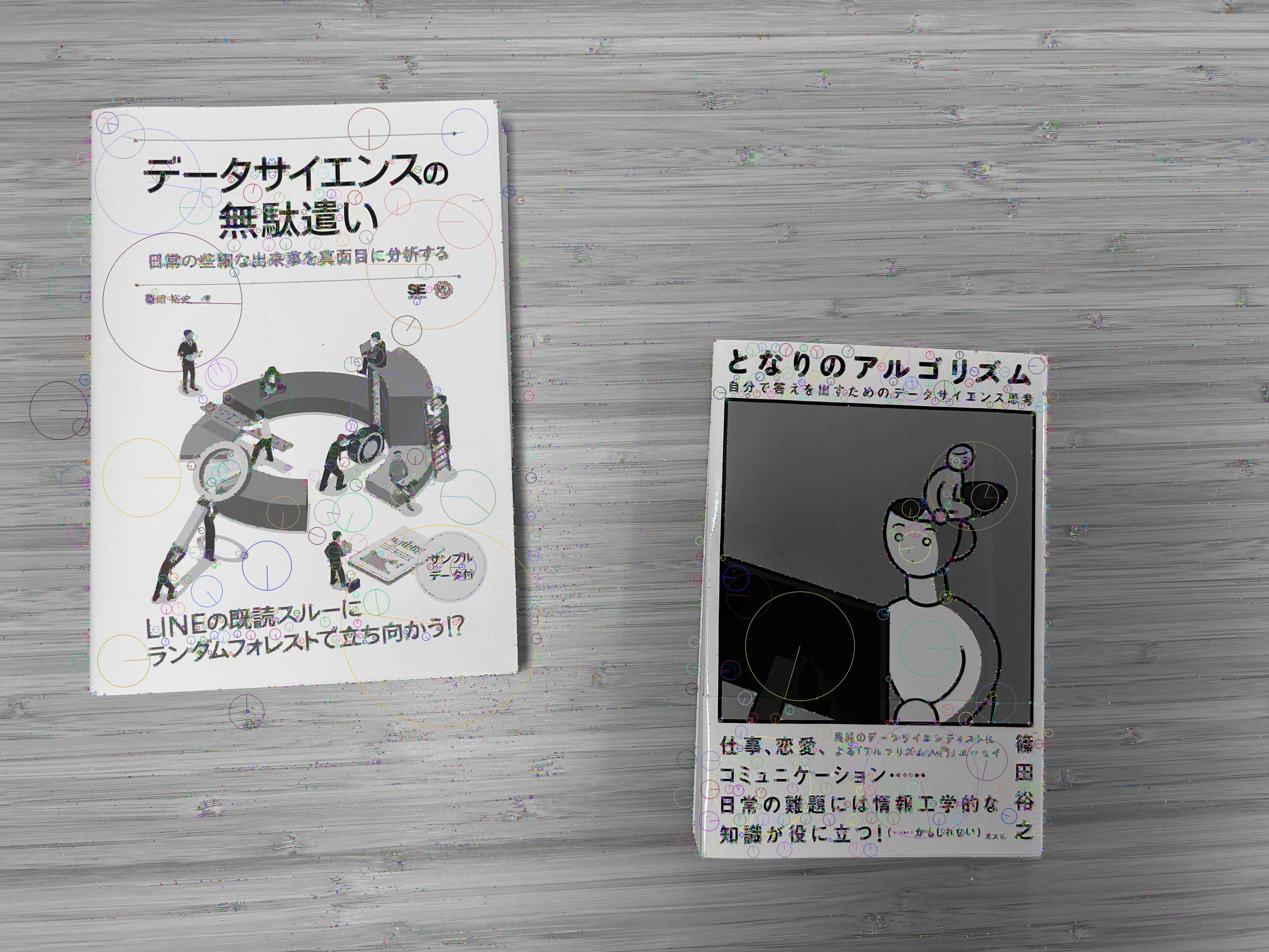 [6] という特徴記述子を使用します。SIFTは、画像内のスケールや回転に不変な特徴点を検出します。以下はSIFTの検出結果です。