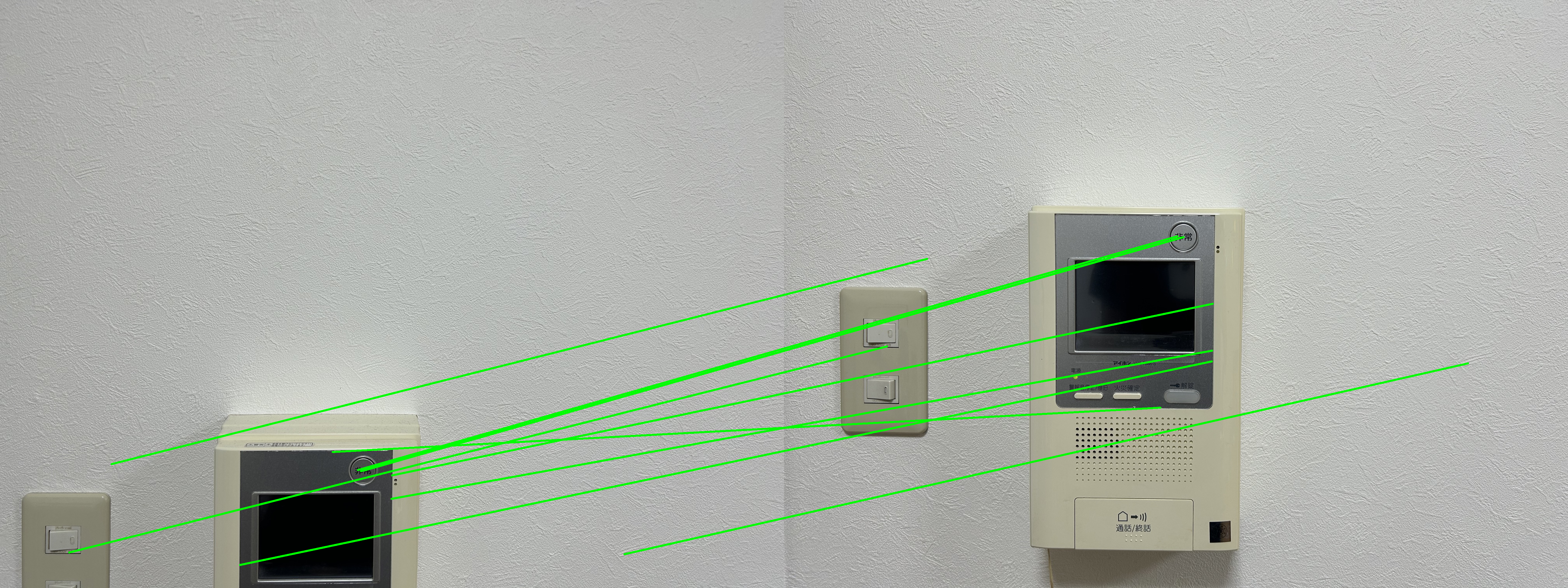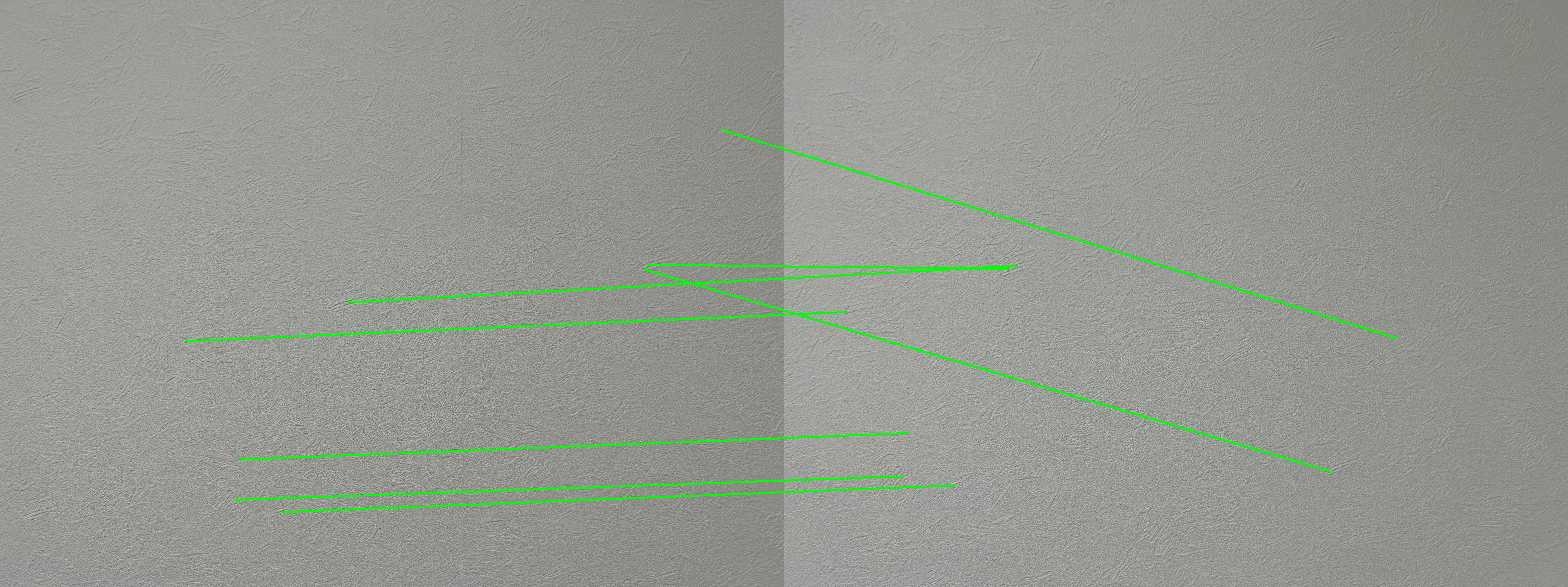 それでは検証に入ります。 まずは白い壁です。以下のように特徴がない領域では特徴点マッチングが上手くいきません。そのためこのような画像でのカメラ位置の復元は困難だと予想されます。