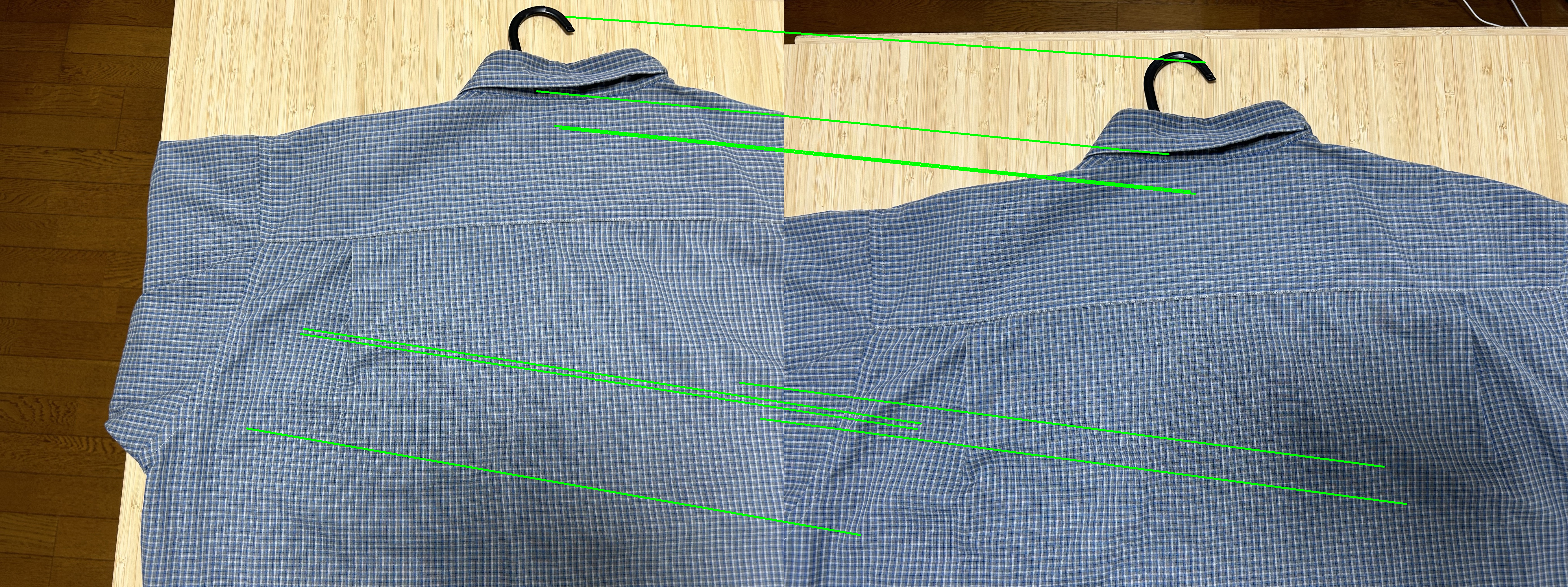 このようなシーンでは、引きで撮影し周りの特徴を補ってあげることで、特徴点マッチングが上手くいきます。 以下の例では、引きで撮影することで服の中でも襟元や左袖付近といった特徴を把握することできます。