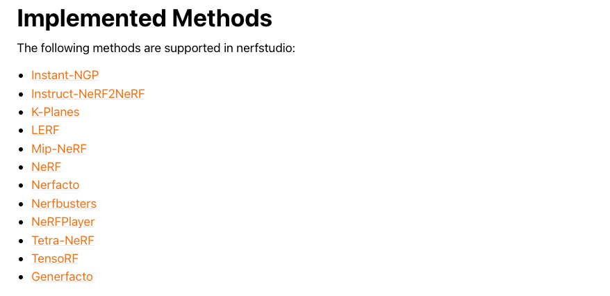 nerfstudioで使用可能なモデルはさまざまありますが、Nerfactoがデファクトで精度、速度に応じて好きなモデルを利用可能です。