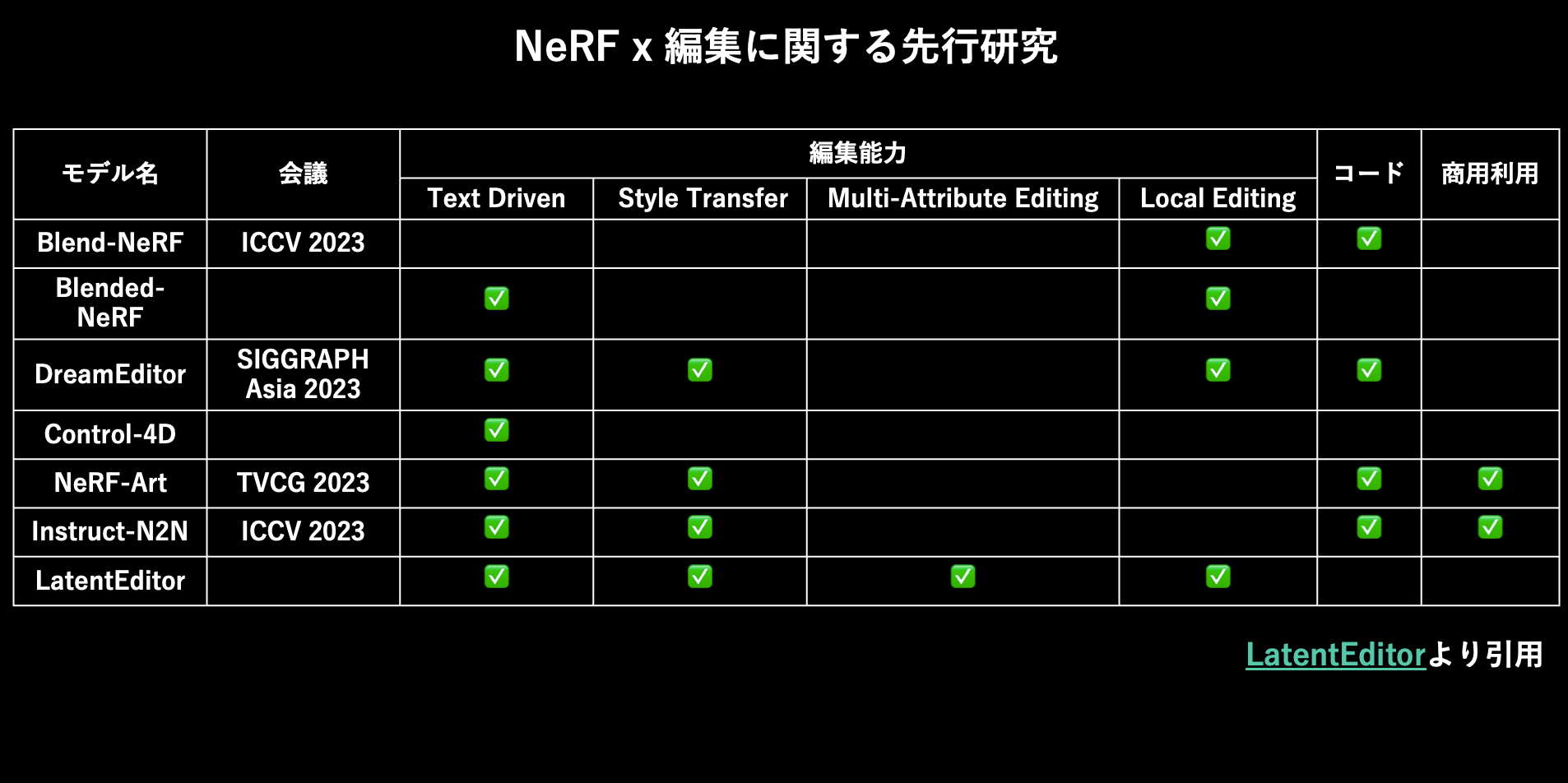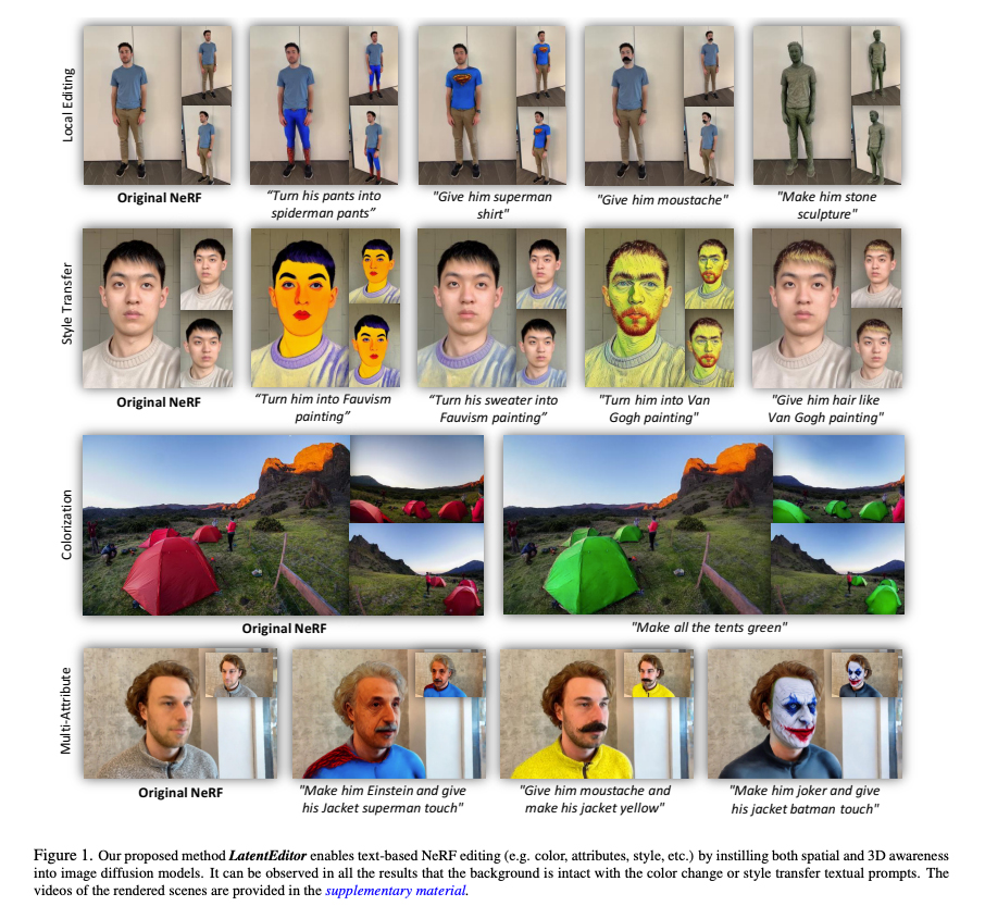 1番上がオリジナルのNeRFで、2番目は「Make it Old Delhi.」でインド風に編集したNeRF、3番目は「Make it a neon city.」でネオン風に編集したNeRFとなります。新規の視点から見た動画においても非常高く一貫性を保ちながら編集できていることがわかります。