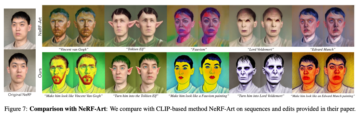 定性評価では、NeRF Artと比較が行われています。NeRF Artの場合、テキスト入力が具体的な指示ではなく、モデルが何を編集すべきかについての曖昧さが存在します。例えば、「Vincent van Gogh」の例では、モデルがゴッホのスタイルで絵を描くべきか、それとも顔をゴッホのように見せるべきかが不明確です。プロンプトの明確性は非常に重要であり、編集者の好みや意図を明確に反映させる必要があるようです。