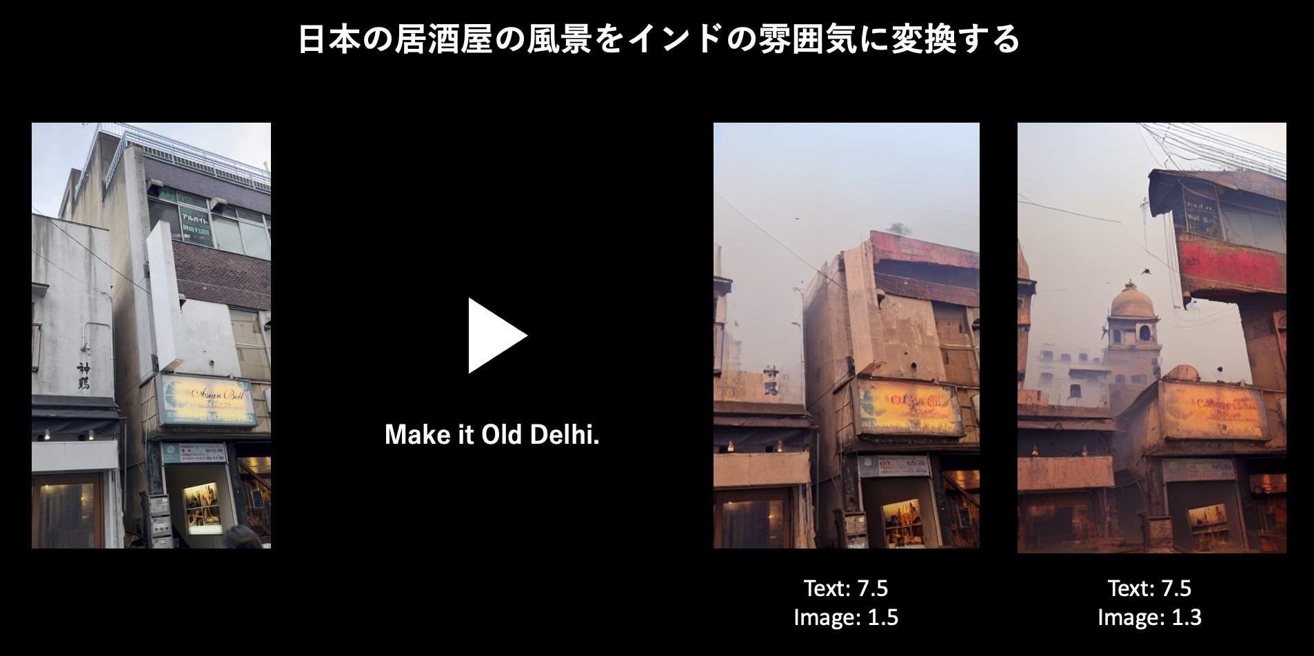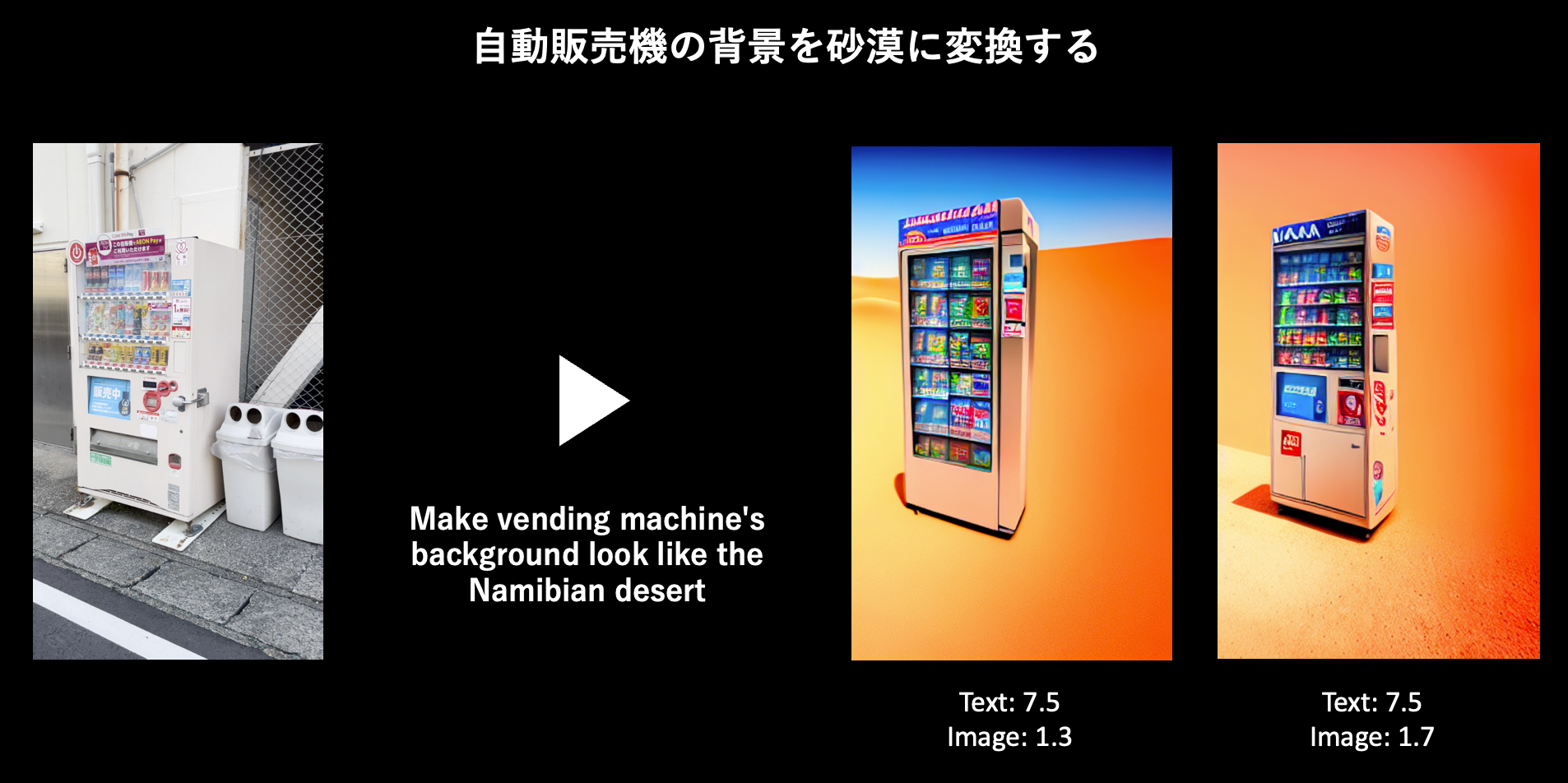 NG例も紹介します。「Make vending machine's background look like the Namibian desert」というプロンプトを用いて、自動販売機があたかも砂漠の上にあるかのような画像生成を試みました。しかし、Image CFG weightを1.7に変更しても元画像とは大きく乖離することとなりました。
