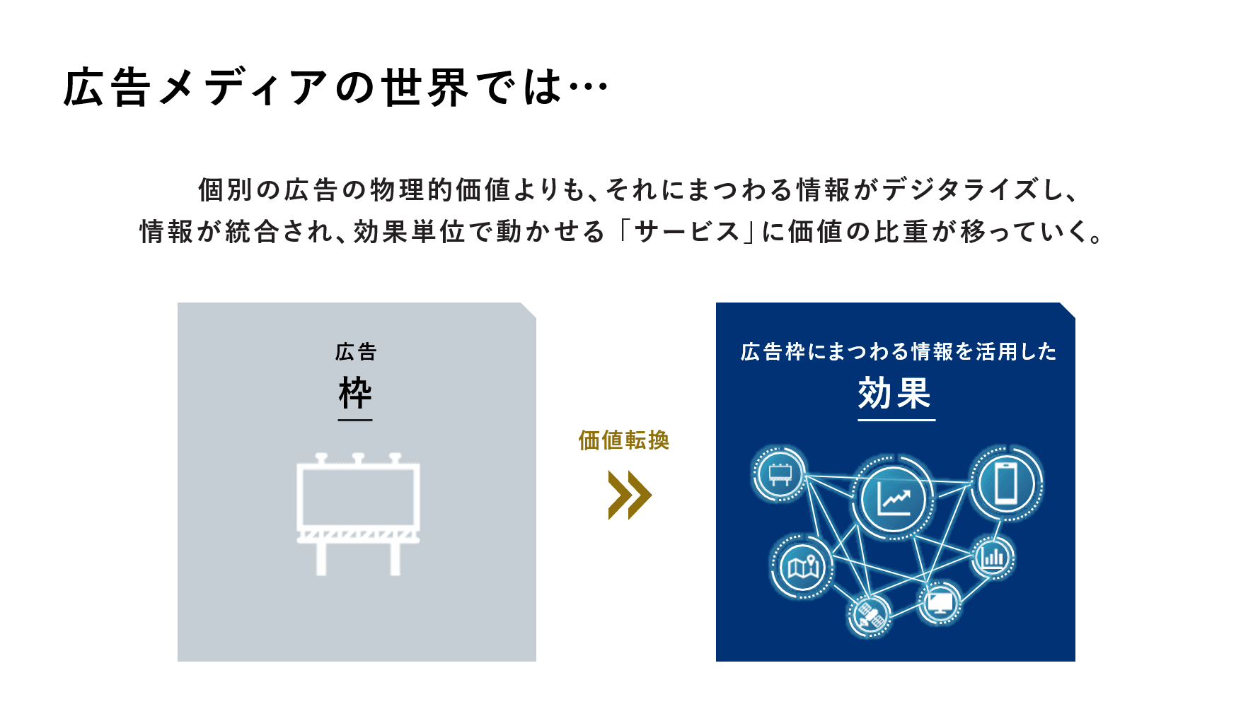 広告業は6兆円規模のビジネスとなっていますが、広告枠の売り買いで収益を上げている側面が非常に大きい。「枠」の売り買いというのは、あえていえばモノの売買と同じようなものだと考えられます。しかし「枠」ではなく、広告にまつわる「効果」を売り物にすることが、本当の「サービス」化ではないでしょうか。