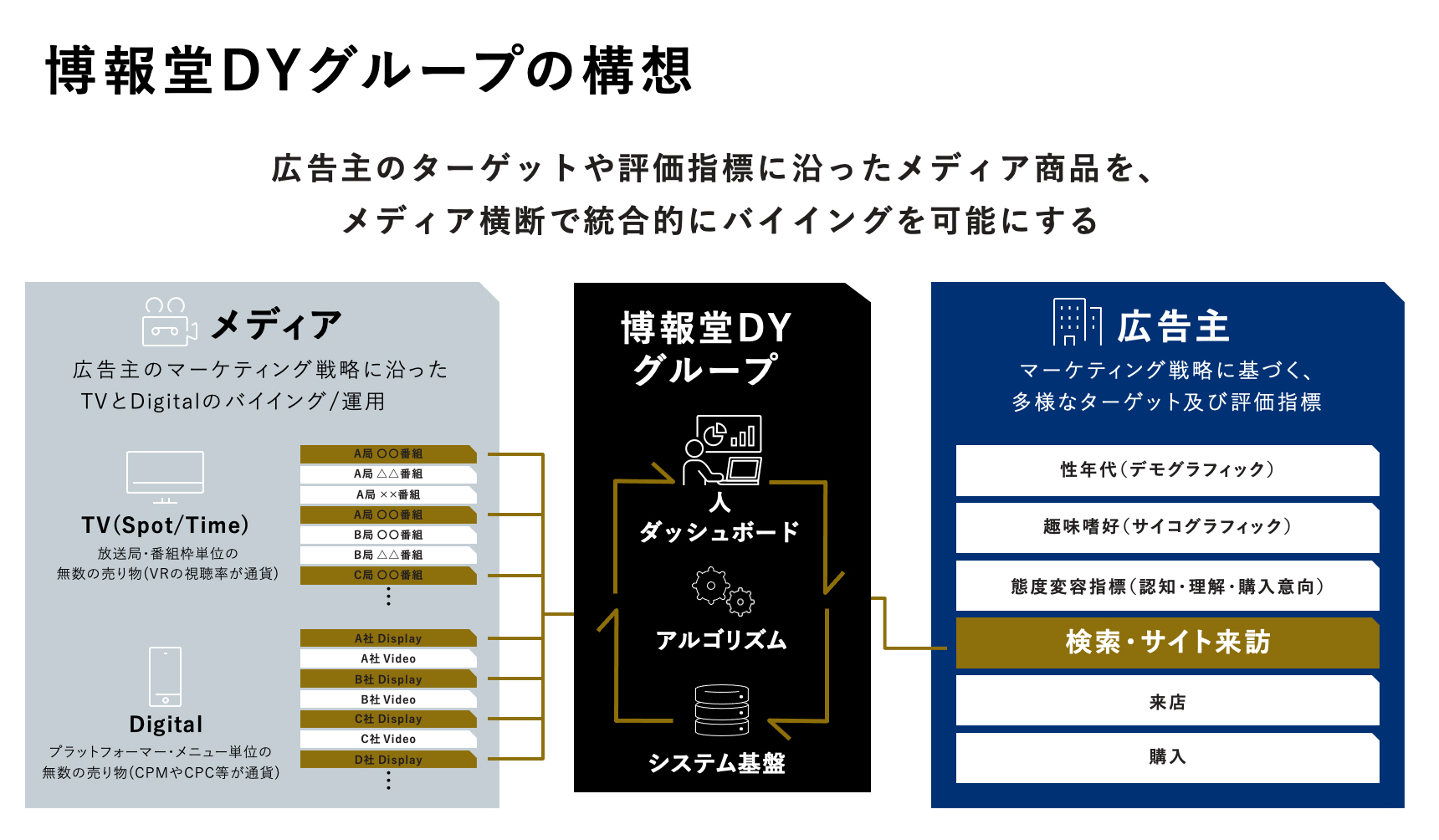 例えば、検索やサイト来訪や、認知やブランド好意をあげる等、目的に応じてテレビとデジタルを横断し、広告を提供していく。目的にダイレクトに応えていきます。