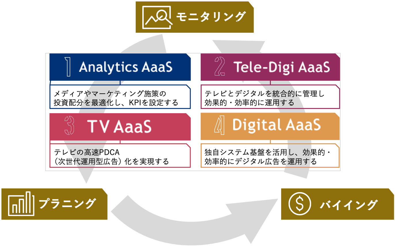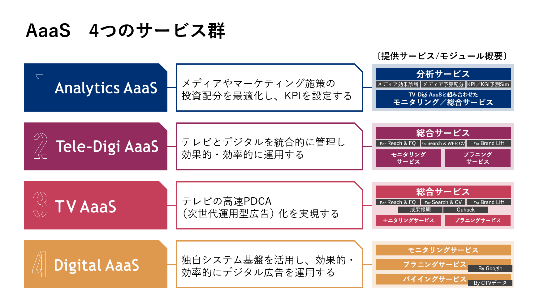 事業成果を最大化するためのメディアの投資配分、KPIを設定することができる「Analytics AaaS」。テレビとデジタルを統合的に運用することができる「Tele-Digi AaaS」。テレビだけ、デジタルだけで運用を最適化できるサービス、「TV AaaS」、「Digital AaaS」の4つです。