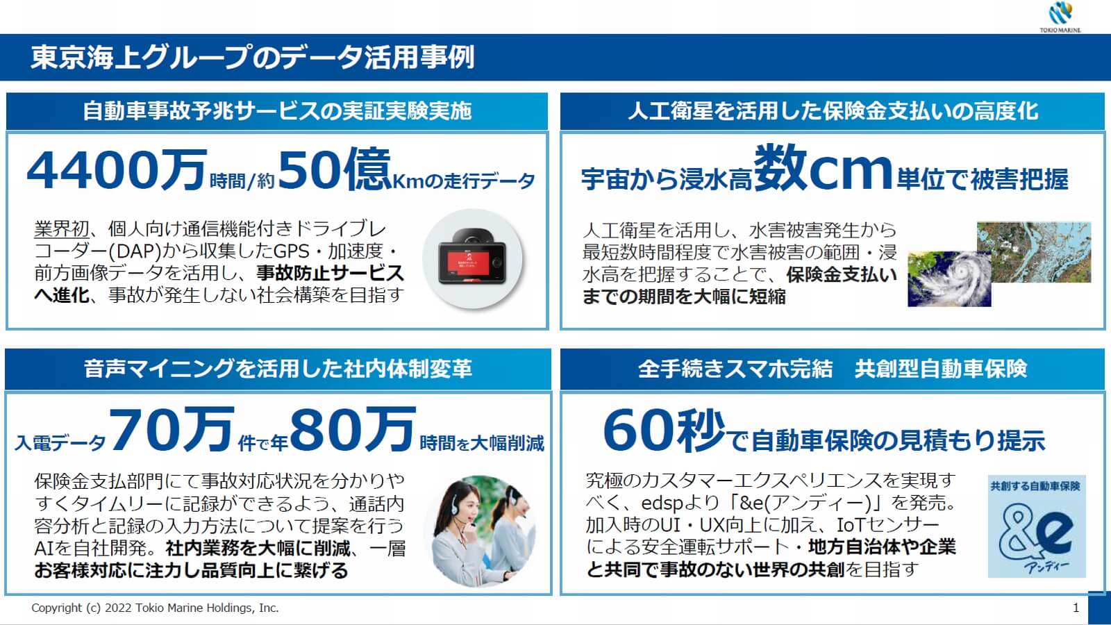 当社ではデータの活用/DXは戦略の中心において多岐にわたる領域での取り組みを進めていますが、東京海上グループのDXの代表的な事例として4つご紹介します。まず、「自動車事故予兆サービスの実証実験」です。国内の中核会社である東京海上日動は、業界で初めて個人向け通信機能付きドライブレコーダー(DAP)を発売しました。収集した4400万時間分のGPS・加速度・画像データを、自動車事故発生の予兆を示すデータとして活用し、グループ全体で事故防止サービスの進化に取り組んでいます。