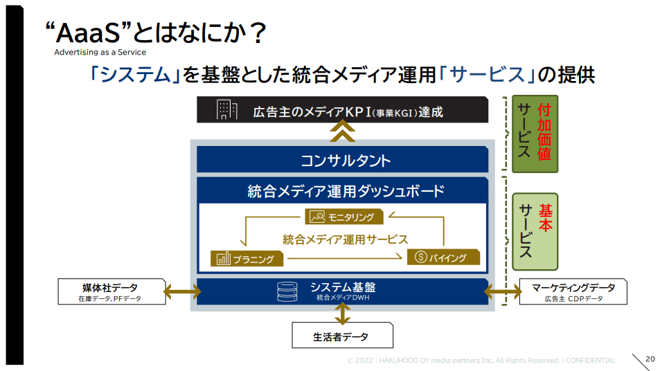 また、メディアデータと博報堂DYグループが保有するデータを連携し、核となるアルゴリズムを開発しました。さらに、専門のコンサル集団を有し、ダッシュボードを活用した常時接続型のサービスを提供、クライアントの成果創出にコミットするようにしました。これらの3要素により、業界最速でAaaS構想を具現化したいと考えています。