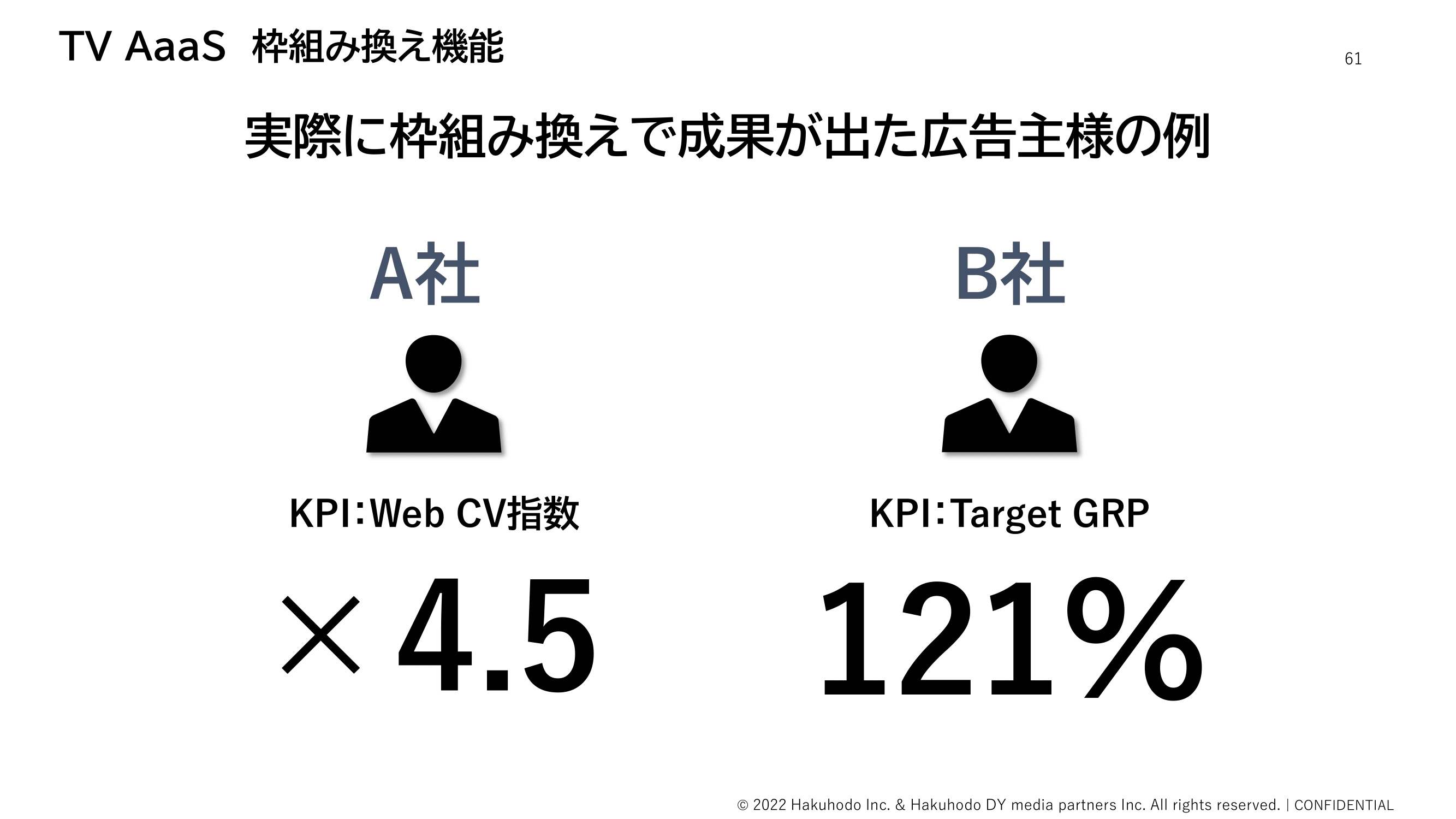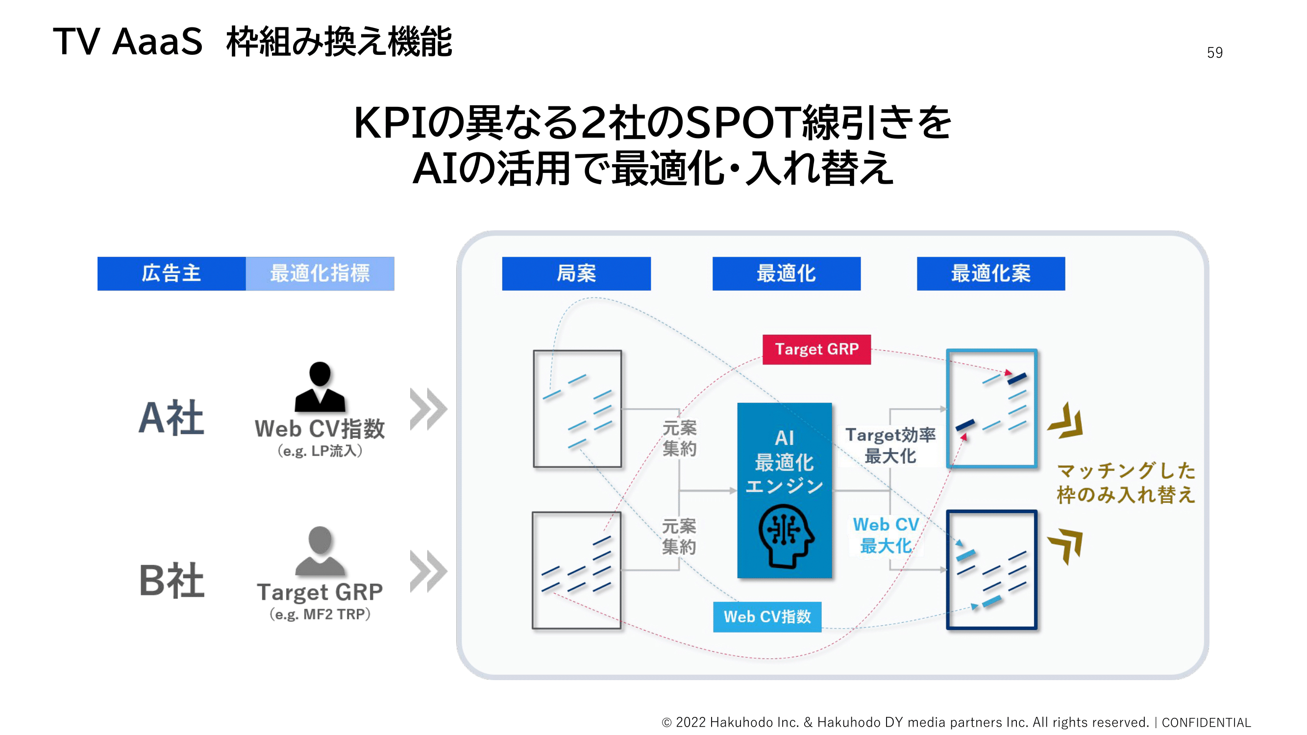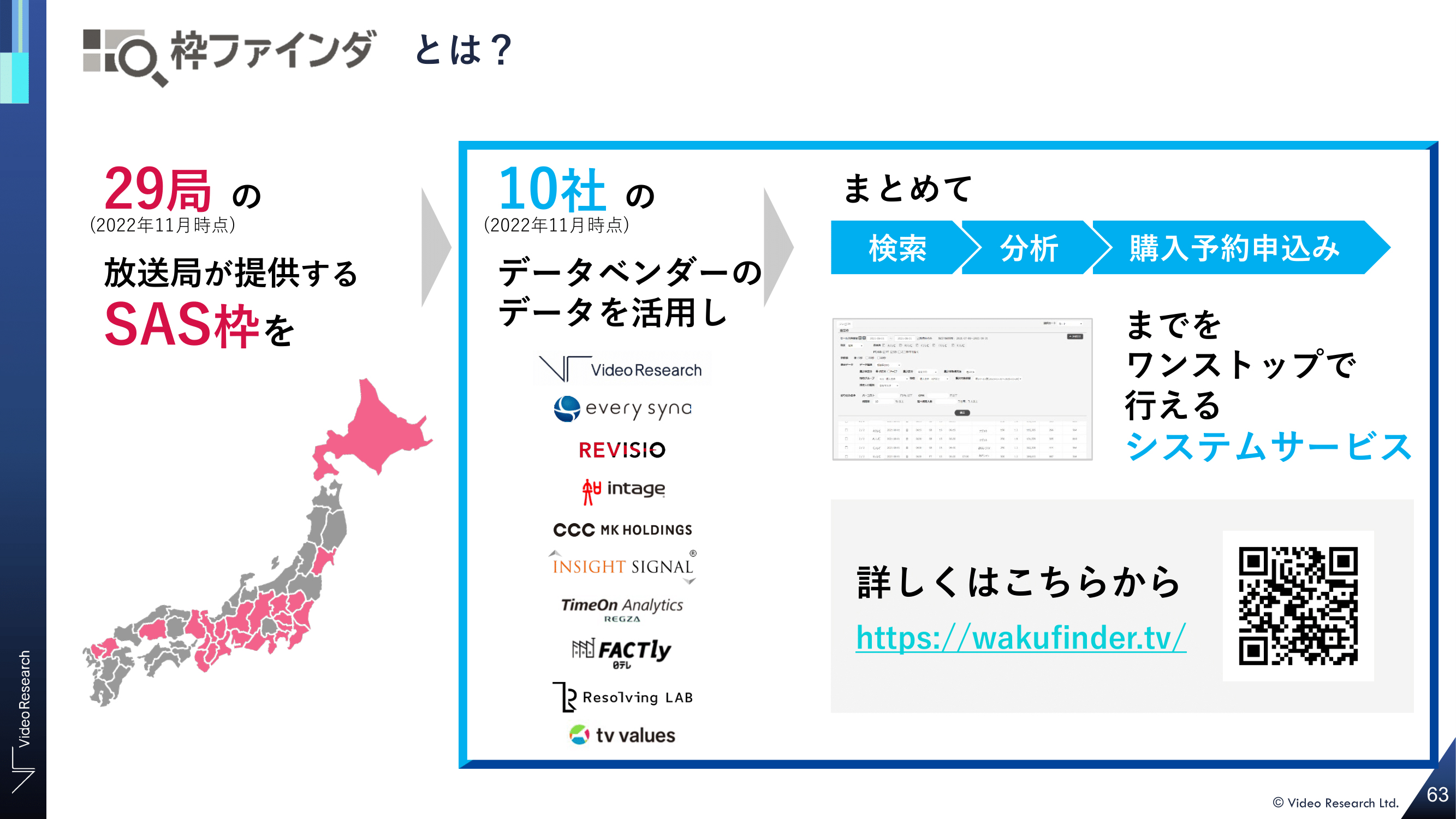 そしてバイイングとの断絶は?新たな可能性を切り開くプログラマティックプランニングですが、課題もあります。飯塚氏は、データのカバレッジについて指摘。「OTTやDOOHなど、メディアが増え、デジタル化し、さまざまなデータを集めなければならなくなっている」と、対応に注力している現状を語りました。しかし、個人情報保護の観点や戦略上、メディアからデータを提供してもらえないことが多くなっている現状も踏まえ、田部氏は、マーケティングデータは完璧には取得できないという認識が必要ではないかと問題提起します。「どうしてもデータでは特定できない領域は存在するので、予測すること、もしくは指標をシンプルにすることが大事ではないか。データを取り扱うことは目的ではなく手段であるべきでは」と語りました。Xandr Japanの城西氏は、グローバルの視点からプログラマティックプランニングにおけるデータの課題に触れました。「デジタル広告の領域においても、3rd Party Cookieが取得できなくなっている流れの中では、ユーザーに対して説明できないデータは排除されていくだろう」と予測。データに対する制御と透明性の担保が、どこの国でも肯定的に捉えられるのではないかと、今後の方向性を示唆しました。続いての大きな課題として、プランニングとバイイングの断絶についてディスカッションを進めました。データセントリックに最適なプランニングを行えたとしても、バイイング時にコストが高くなり実現できないといった問題に対し、田部氏は、「テレビはデジタルと違い、広告枠が有限。限られた枠に対し、多くの企業の要望があり、100%の最適化は理想だが実現は難しい。そのことを理解し、50~60%でも最適化を目指すのでもいい。テレビ業界や構造を理解した上で、最適なプランニングをすれば、バイイングもできるのでは」と提言しました。飯塚氏は、精緻なプランニングでコストが高くなることについては、そこでKPIをどれだけ効率化できるかが重要と語ります。KPIが向上することで、結果として投資効率が良くなることがある、という考え方です。また、広告主によってKPIは異なるため、同じ広告枠でも、A社では成果が出ていないが、B社では成果が出る、ということもあります。それらをAIで分析し、両社のスポット枠をスイッチすることで結果として両社の成果が上がった事例を紹介。このような分析は、従来は表計算ソフトなどを使用し、手作業で行っていたと言いますが、現在はAIによって劇的に時間短縮できるようになったとのこと。こうした取り組みは、プランニングとバイイングの断絶を解消する大きなヒントになりそうです。続いて、放送局側の新たな取り組みとして「Smart Ad Sales(SAS)」という商品と、それを支える「枠ファインダ」というビデオリサーチ社が提供するシステムサービスの紹介を小木が行いました。枠ファインダでは、各放送局が登録したSASの広告枠を、価格やセールス状況を実際に確認しながら、欲しい日付・ポジションを指定して15秒1本から購入予約申込が可能です。さまざまなデータ会社のデータが搭載されており、データを元にしたプランニング、それをそのまま購入予約申込できるという点で、プランニングとバイイングが直結したものとなっています。さまざまなプレイヤーとともに、業界全体で考えていくことを