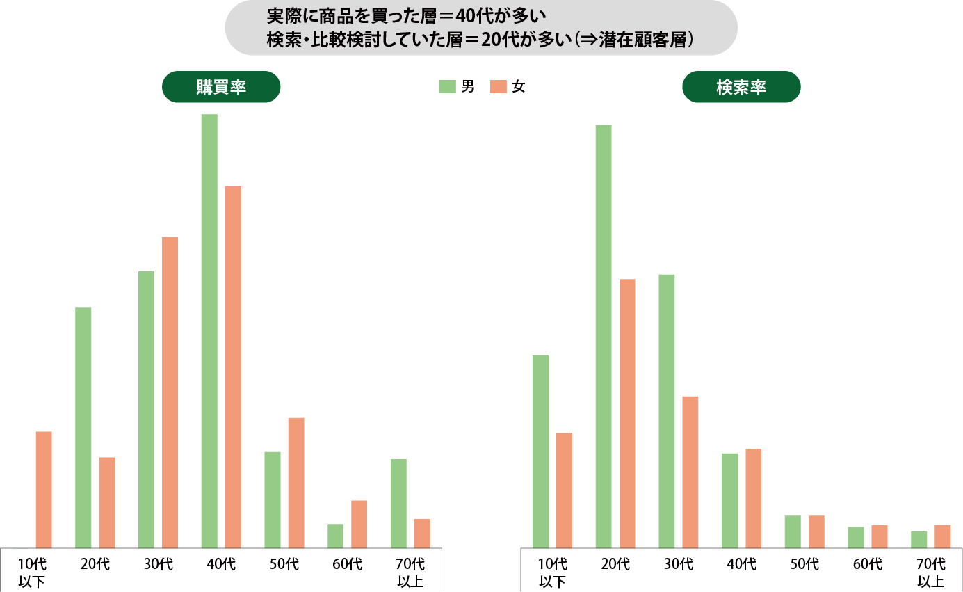 深く分析していくと、例えばテレビとデジタルの両方に出稿した場合は、それまであまり検索をしなかった人が新たに検索する傾向があることが分かりました。また、ある商品の購買層は40代が中心だが、実はその商品について検索しているのは20代のユーザーが多い、といったユニークな傾向が見つかることもあります。この場合は、20代の潜在顧客層をターゲットにした新たなプロモーションを打つことで、より顧客層を広げられるかもしれないという示唆が得られたわけです。