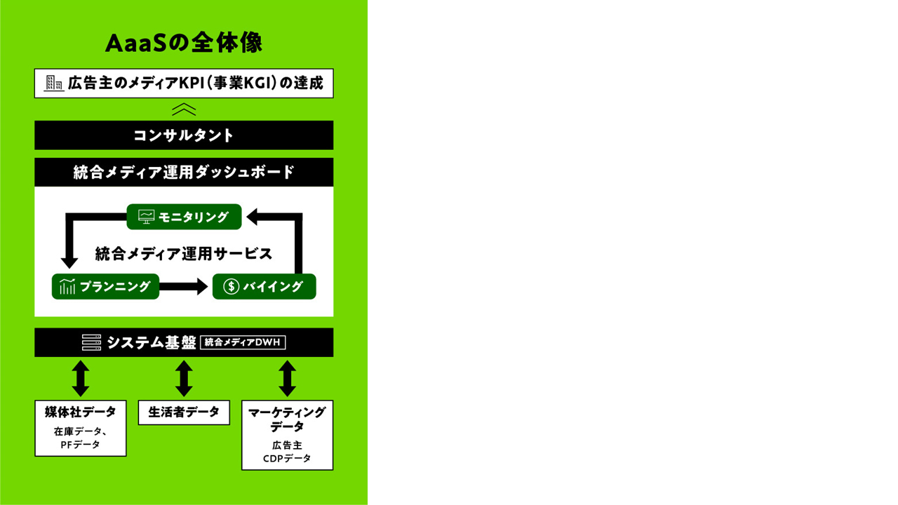 AaaSに関連するデータ/ソリューション群を基盤とし、メディアプラナーとクリエイターが一体となって、クライアントのKPIに対して、何が最適解なのかを考え、その実現に向けてPDCAを回していくチームです。