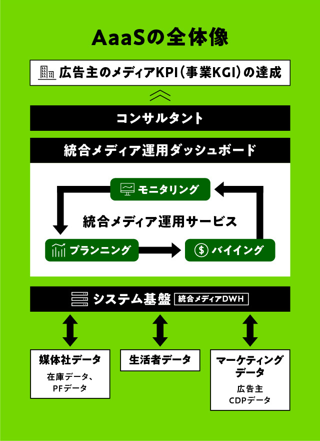 博報堂DYグループでは従来型の「広告枠」をクライアントに提供するビジネスモデルから、「広告効果」を提供するビジネスモデルへの転換を図ろうと考え、AaaS(Advertising as a Service)という次世代型の広告モデルを提唱しています。