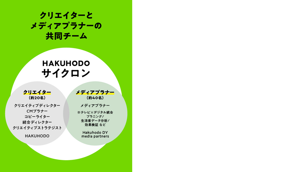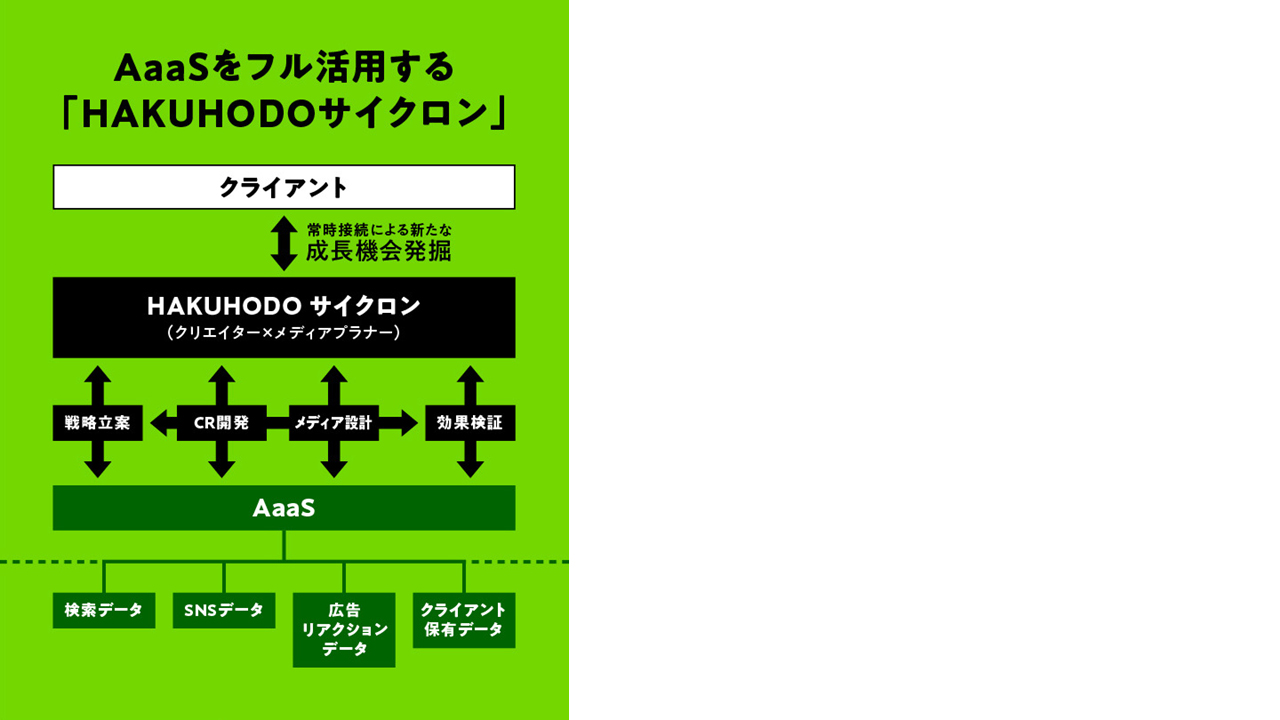 こうした状況を踏まえ、メディアプラナーとクリエイターでAaaSを活用しながら戦略立案から効果検証まで一気通貫して担当し、常時接続型で広告効果向上に向き合うチームとして、「HAKUHODOサイクロン」を立ち上げることになりました。