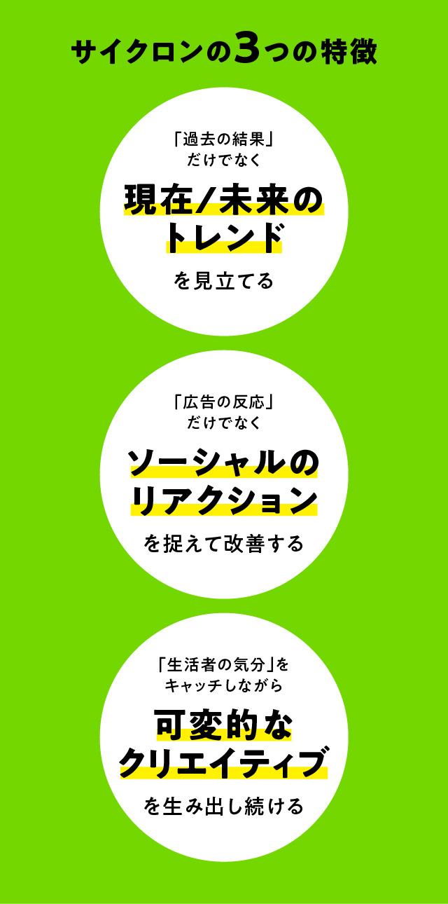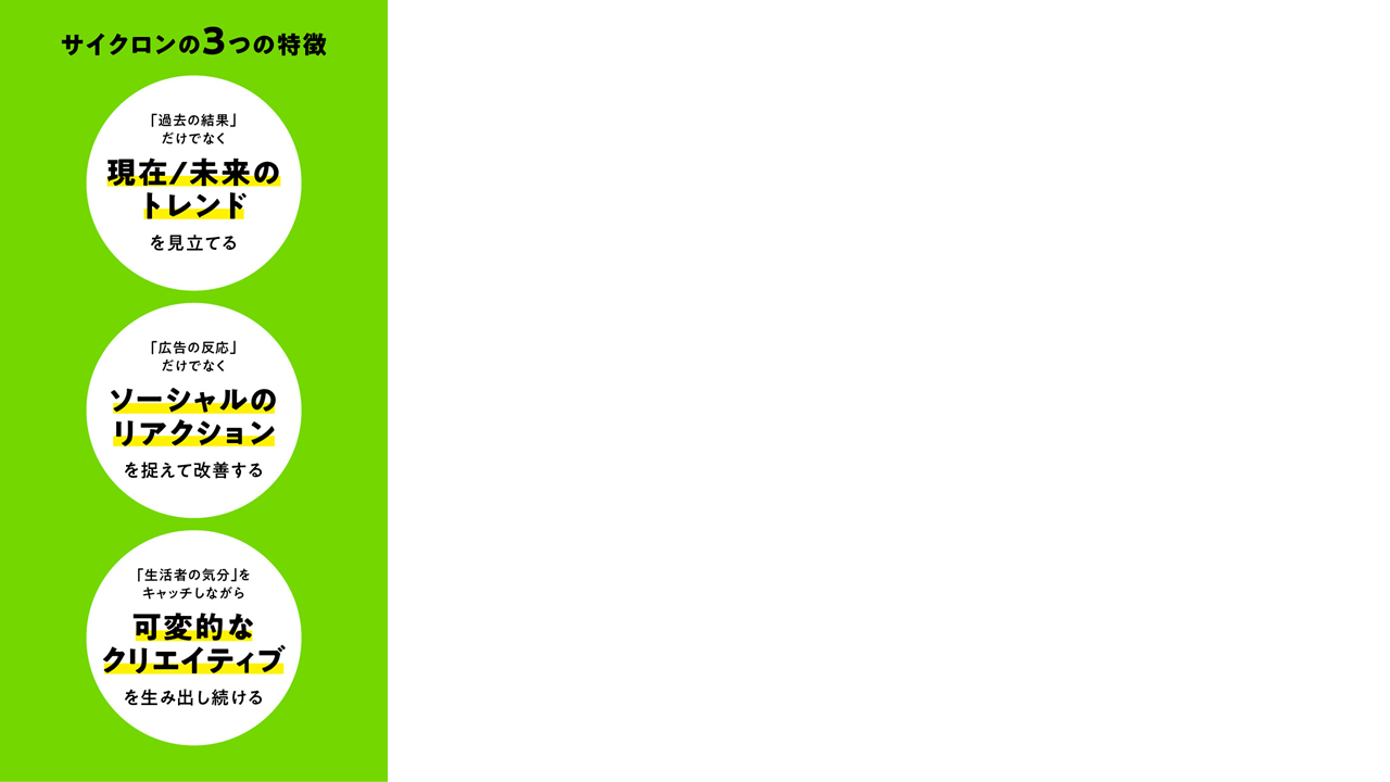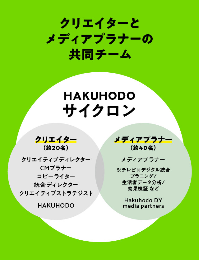 HAKUHODOサイクロンは、フラットな仮説ベースではなく、様々なデータを根拠に動きながらも、単純な「正解」だけでなく「別解」も発想し、広告の結果にコミットできる「これからの事業成長に必要な」チームです。