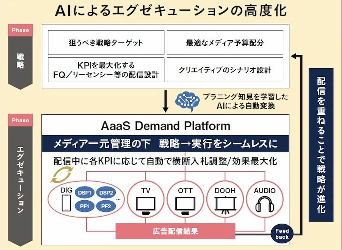 「AaaS Demand Platform」はAIを活用し、策定した広告戦略をシームレスに媒体横断で再現し広告配信を最適化・実行するエグゼキューションプラットフォーム。広告配信結果を戦略やADPに戻すことで、戦略立案・実行を繰り返し学習し進化していく。