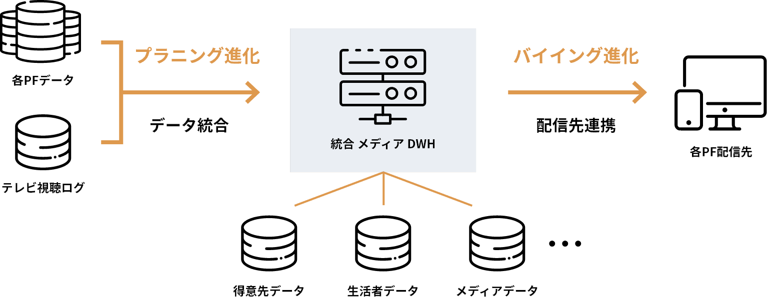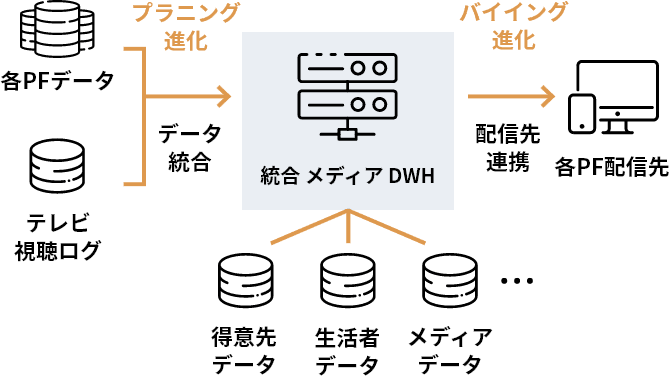 各種PFと連携した、広告オーディエンスの多面的な分析のダッシュボード上での提供や、テレビ視聴ログを活用したテレビの実視聴状況の分析など、様々な分析を手軽で安価に提供。更に、配信先としても連携を行うことで、分析結果によるプラニングからバイイングまでをシームレスに実現。