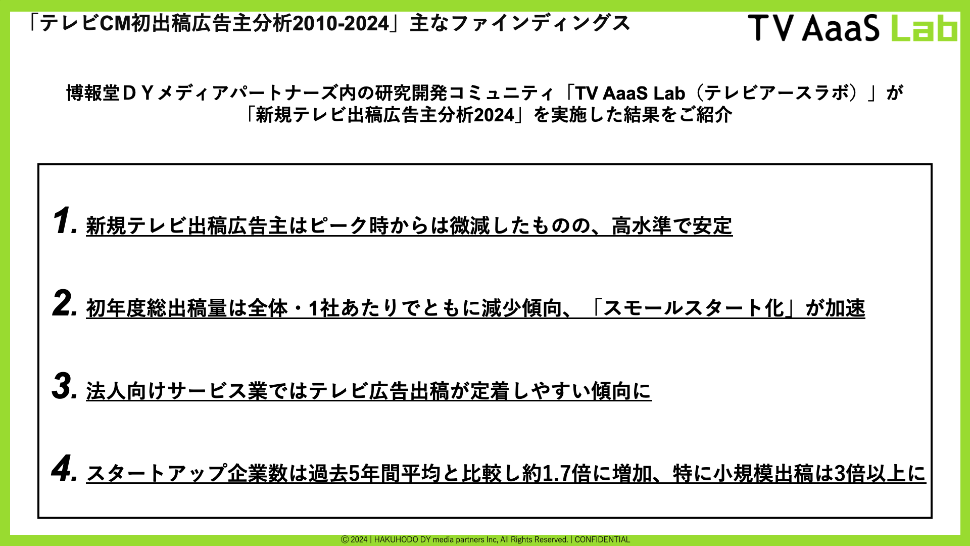 TV AaaS Lab研究レポート「テレビCM初出稿広告主分析2024」