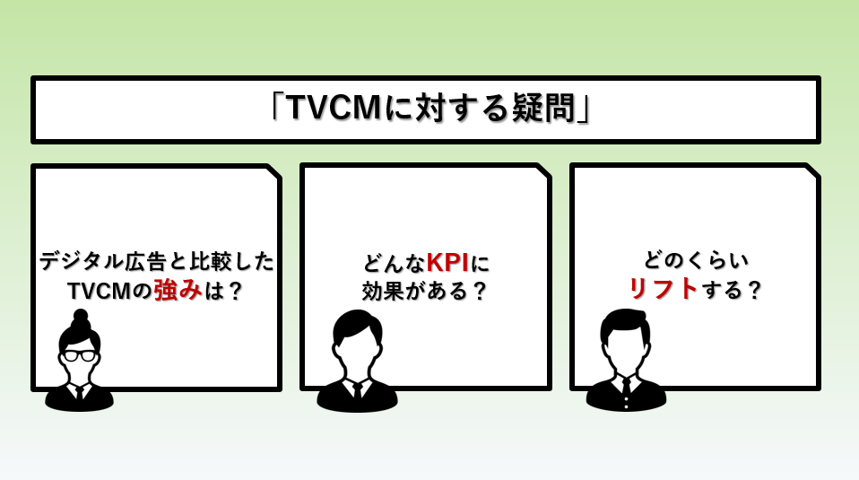 TVCMも含めたメディアマーケティング全体での「広告効果の可視化」や「費用対効果を高めるためのPDCA」について、最も多くお問い合わせいただきます。特に、広告効果が明確にレポーティングできるデジタルに対し、効果はありそうだという肌感はあるものの、実効果の不透明性が高いTVCMの実施に踏み切れずにいる広告主は多いです。効果はあることはわかっているが、その効果が投資対効果として適切なのか、どのような効果が出ているのか、ターゲティングを出来ないのであれば無意味ではないか、PDCAを回せる余地があるのか、といった悩みが主たるものです。