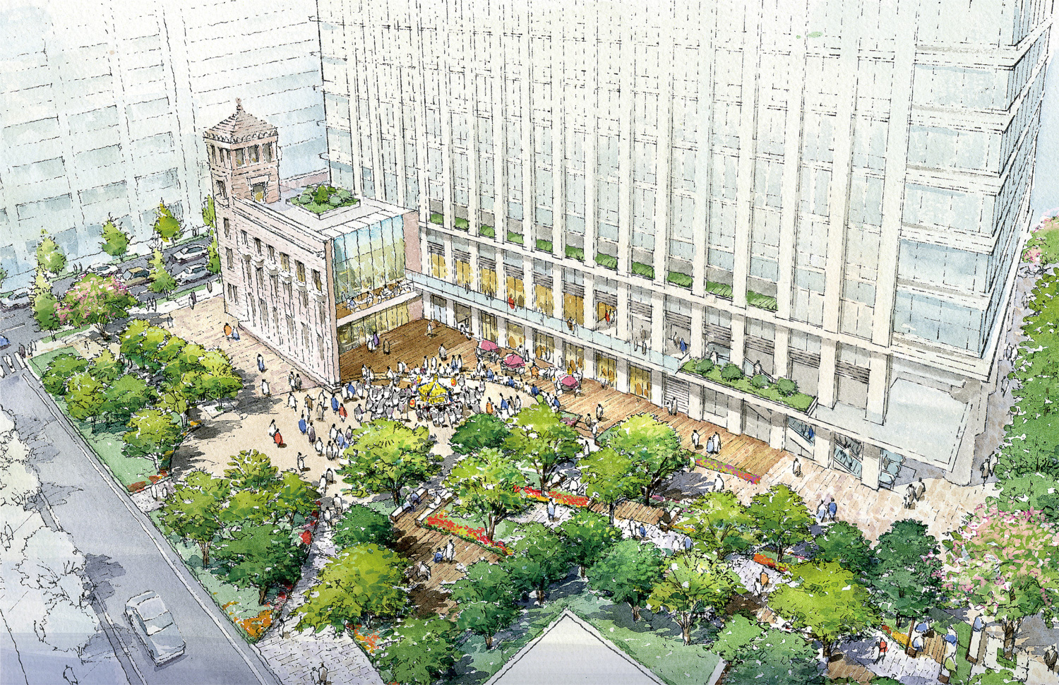 神田錦町の再開発で、複合ビル「テラススクエアビル」として生まれ変わり、博報堂の本館ビルは、ファサードとして完全復元されて、神田の町に昭和初期の面影を残すことになりました。