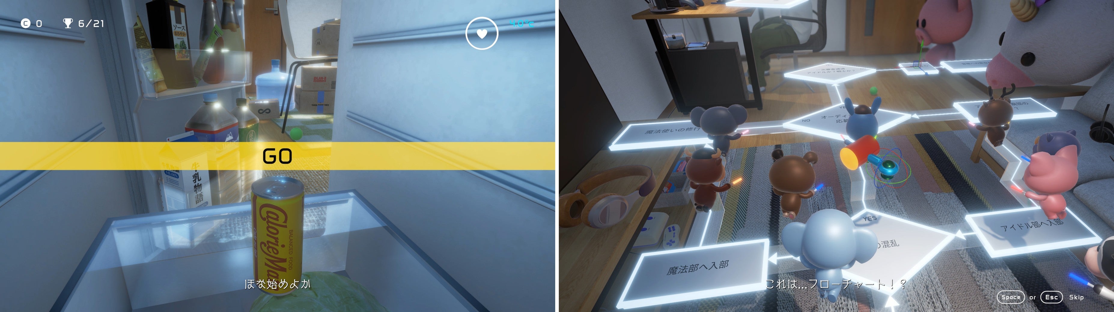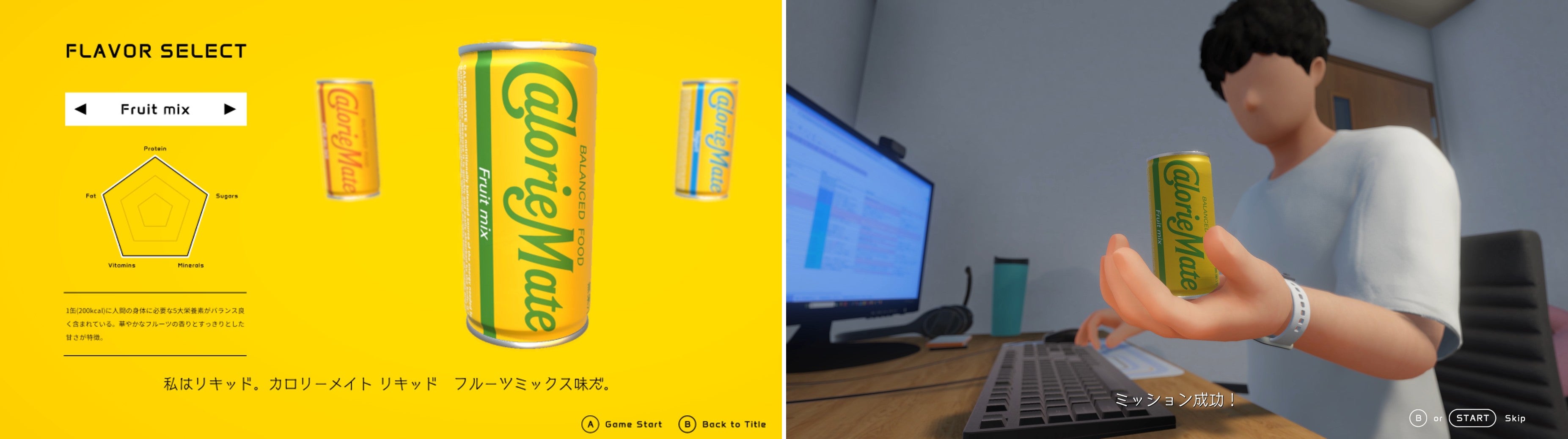 ゲームの主人公は、カロリーメイト リキッドの「缶」。冷蔵庫から飛び出し、仕事に没頭するゲームクリエイターのもとへと届けられるアクションゲームです。