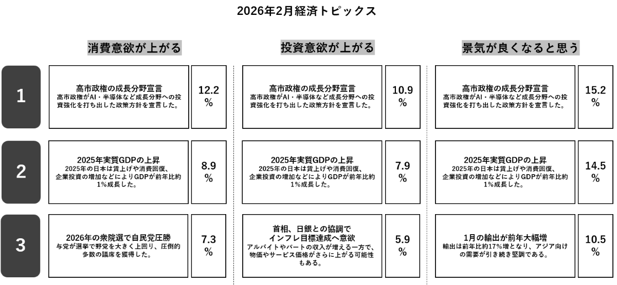 「消費意欲」「投資意欲」「景気が良くなると思う」の3観点に対し、いずれも「高市政権の成長分野宣言」が最も高く、特に景況感での寄与が大きいことから、人々は実績よりも将来の成長ストーリーに期待している様子がうかがえます。次点には2025年の実質GDP上昇が並び、足元の景気改善も一定の安心材料だが、数値は全体に20%未満と慎重ムードも根強いです。消費面では自民党の圧勝による政治的安定、投資面では円安是正期待なども影響しているが、為替など外部要因より国内の成長戦略への期待が左右していると見受けられます。
