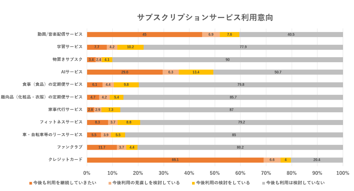 また、AIと学習サービスは対照的な動きを見せる。AIは効率化ツールとして実用段階に入りつつあり、今後の拡大が期待されるのに対し、学習サービスは関心の高さに反して継続が難しく、利用の定着に課題を残す。さらに、食事宅配やフィットネスも一定の需要は見られるものの、価格や手軽さが普及のハードルとなっている可能性もあります。