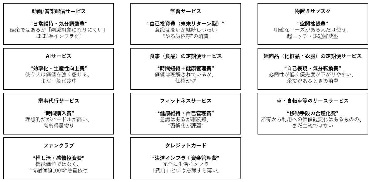 また、AIは作業効率や生産性を高める“実用的な支出”として受け入れられ始めており、従来のサブスクとは異なる価値軸を形成しています。これに対し、食事宅配や家事代行は時間創出という明確なメリットを持ちながらも、価格や心理的抵抗が利用拡大の壁となっています。